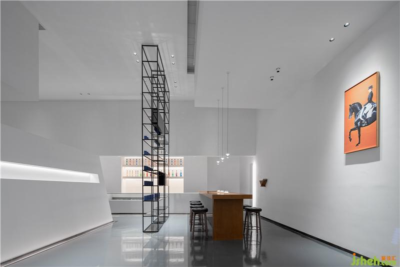 層高3.8米的線條感隔柵與垂直投射的陣列型吊燈相互映襯,演繹出摩登的當(dāng)代設(shè)計(jì)美學(xué)。深度洽談區(qū)的長(zhǎng)桌延伸至吧臺(tái)展示柜,體塊的交疊穿插塑造著獨(dú)特的雕塑感與戲劇趣味。