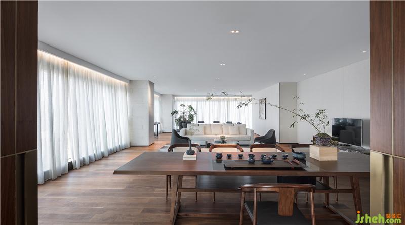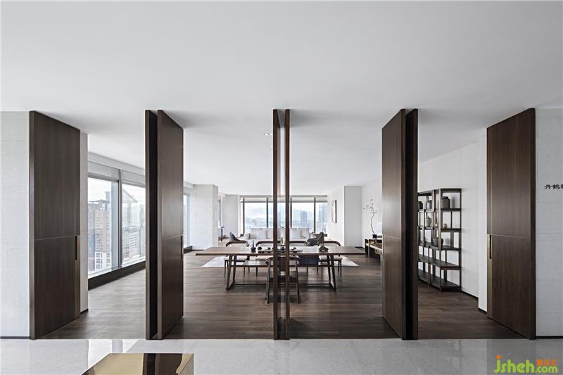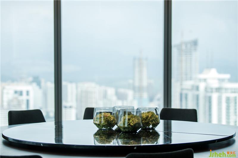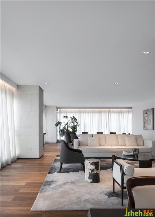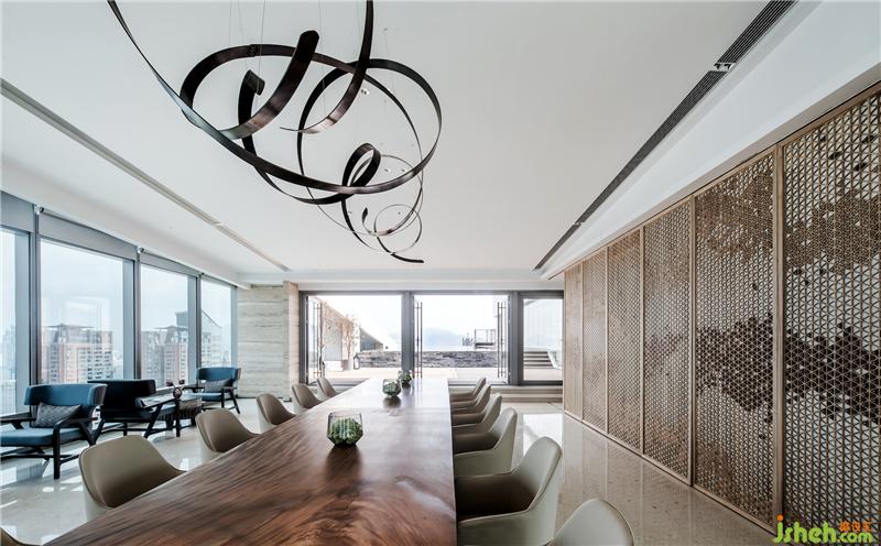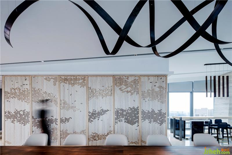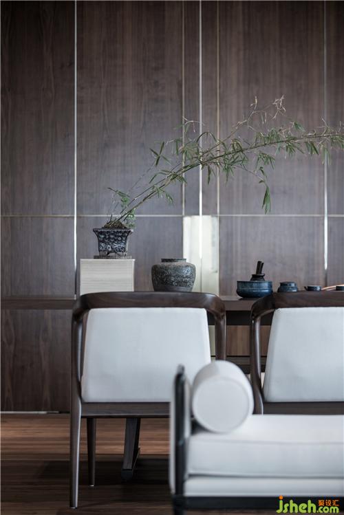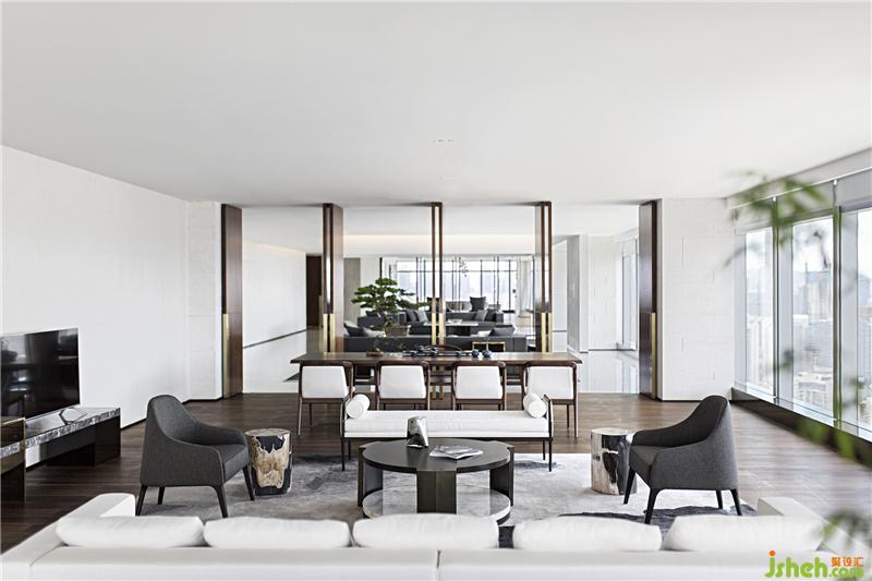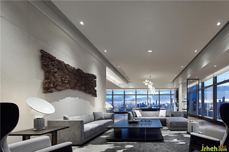素樸的木藝,經(jīng)由現(xiàn)代工法的演繹,成為極具當(dāng)代氣質(zhì)的墻面藝術(shù)裝置,搭配淺色調(diào)布藝沙發(fā)、水珠狀藝術(shù)燈飾,呈現(xiàn)出純粹而有序的空間氣度??臻g的純凈與窗外深圳的都市景觀形成對(duì)話,設(shè)計(jì)師以獨(dú)特的視角凝注天幕之上此時(shí)此刻的曼妙,予人以獨(dú)特的觀感。
