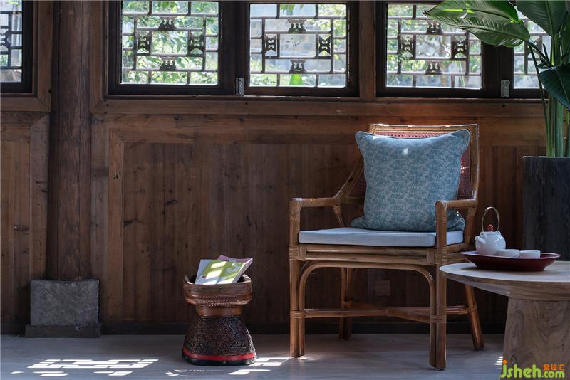 “青山綠水引詩賦,墨瓦白墻牽畫魂。”以窗框為畫框敞其觀戶外四季變換中的水墨宏村奇景,在不破壞建筑外觀的同時設(shè)計保留舊窗格元素對原窗進行擴寬及重設(shè)。室內(nèi)保留部分老木質(zhì)材料及裸露粗獷的木結(jié)構(gòu),讓人感受歲月在其身上流逝的痕跡。