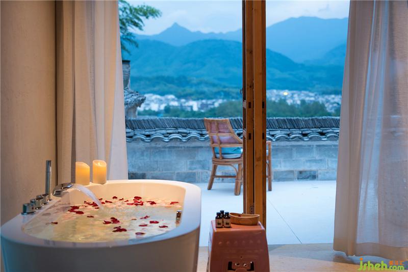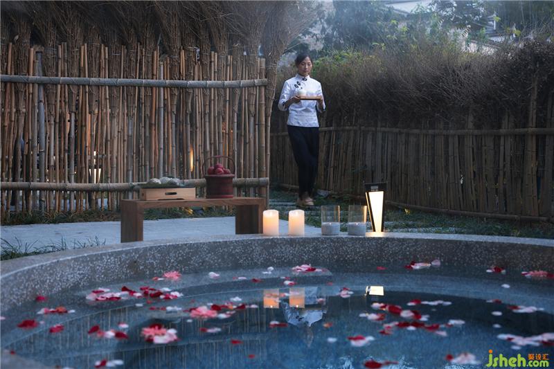 就地取材將院落修整后的竹子制成竹掃把,將圓形水磨石湯池之間作圍合隔斷。
