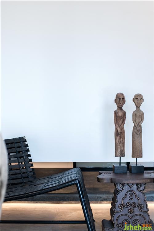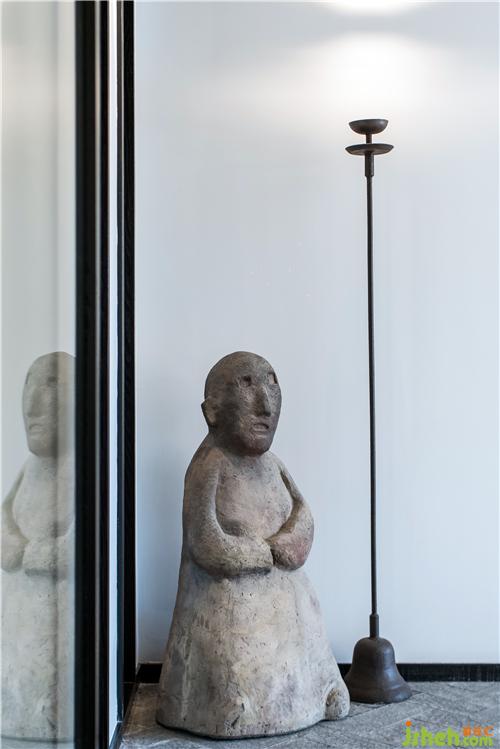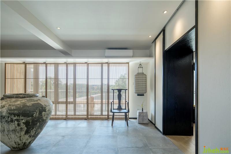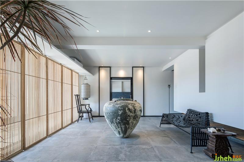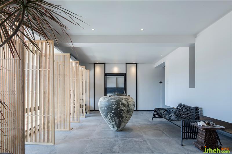 在這一方天地,扇扇淺木質屏風,將明亮的光線過濾成斑駁闌珊的光影;古樸的深口大缸,在輕盈空間中壓下深沉的一筆,將視覺焦點和氣場濃縮凝聚在中央。古董雕塑肅穆而立,鐵藝燈籠墻邊低掛;烏木層疊秩序井然,綠意蔥蔥點綴其中。深藤淺麻,交織成趣;灰石青磚,古而不拙。是已,觀者漫步其中,步步皆景,禪意自如。
