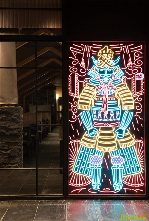 三角構(gòu)造的坡屋頂與霓虹燈武士像,于入口處勾勒出獨(dú)特的日式風(fēng)情。通透的落地玻璃串聯(lián)內(nèi)外,亦令路過(guò)的行人在街頭夜色下窺見(jiàn)這座深夜食堂的美好。