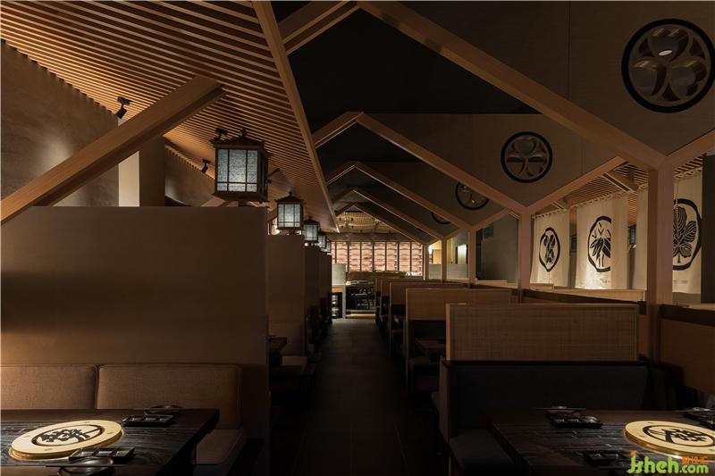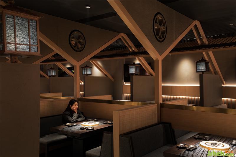 考慮到人在空間中的感受與體驗(yàn),公共餐區(qū)的設(shè)計(jì)別出心裁,采用狹窄的廊道隱喻都市建筑叢林中的街道意象,讓顧客置于溫馨的市井氣息中。而坡屋頂?shù)寞B級(jí)構(gòu)造,演繹出獨(dú)特的日式景觀氛圍,為人們帶來(lái)差異化的空間體驗(yàn)。餐廳設(shè)計(jì)
