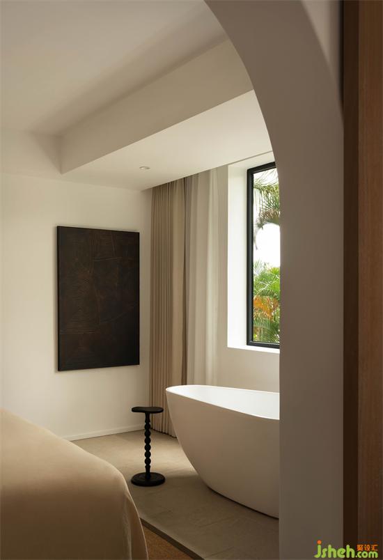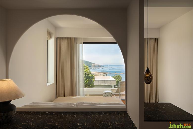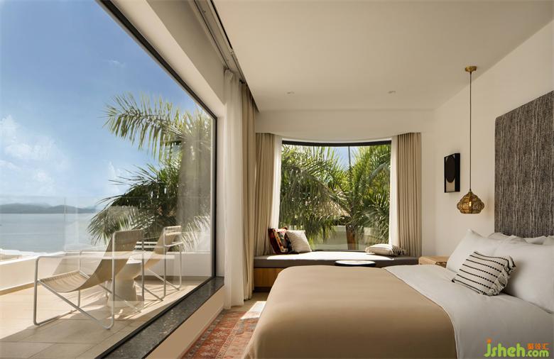 每個(gè)人都會(huì)有 POWER OFF 的至暗時(shí)刻,也會(huì)向往短暫的逃離。度假酒店設(shè)計(jì)而設(shè)計(jì)的本質(zhì),在功能性和情感之間尋求一個(gè)平衡,讓使用者在被主題化的空間里找到自我認(rèn)同。從進(jìn)入房間的瞬間,迎面而來是碧波的無限包容。通過大面積落地開窗,將環(huán)境的生動(dòng)觸感引入到室內(nèi),窗外的山海與綠蔭爭先恐后地跳脫到面前,鮮活而美好。