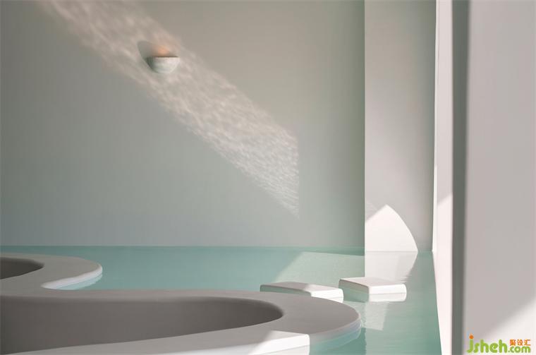 一層大堂的設(shè)計(jì),不同于常規(guī)的功能單一的酒店大堂,設(shè)計(jì)師將空間打造為集接待、休憩、打卡、舉辦下午茶等功能于一體的復(fù)合型場(chǎng)域。淺水區(qū)的高低差,是大堂的神來(lái)一筆,設(shè)計(jì)師取意蜿蜒海岸線(xiàn)的曲線(xiàn)弧度,精品酒店設(shè)計(jì)將淺水區(qū)邊緣打造為功能多變的臺(tái)面,同時(shí)與無(wú)邊泳池、海面形成豐富的視覺(jué)層次感,勾勒出清新怡人的風(fēng)景線(xiàn)。