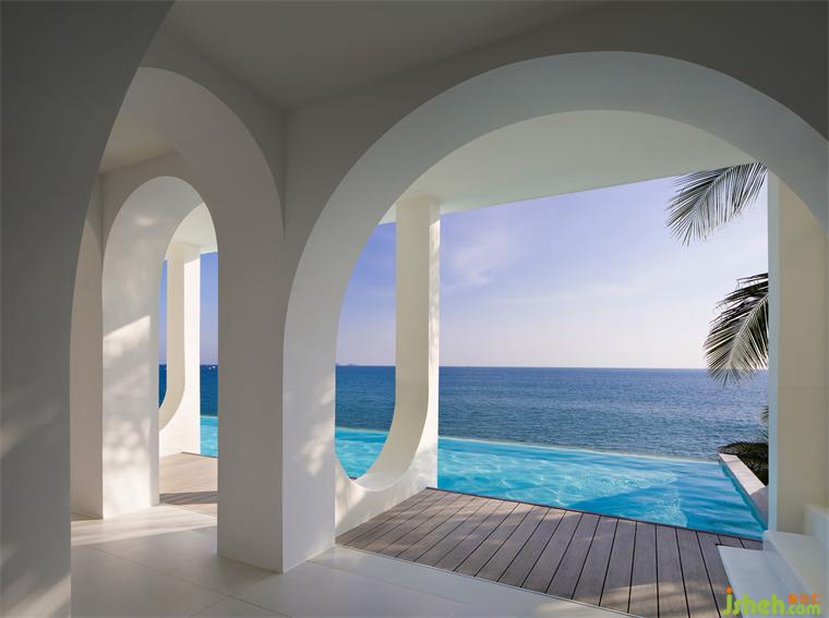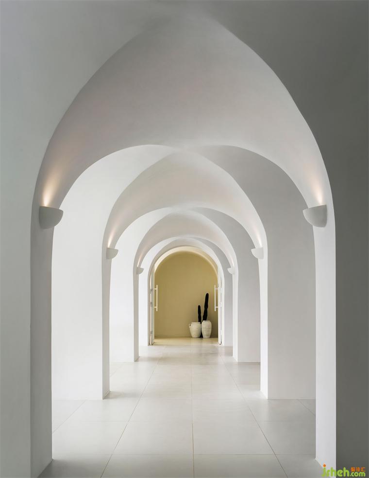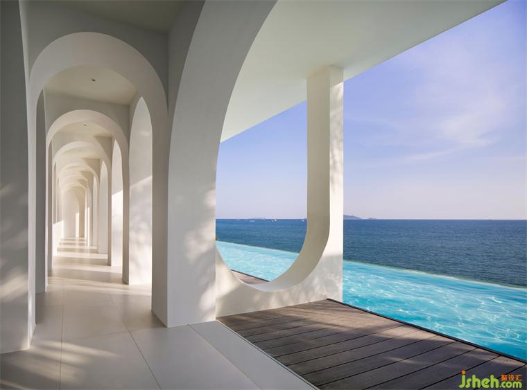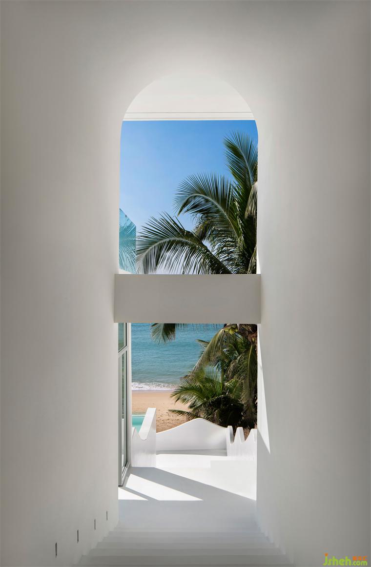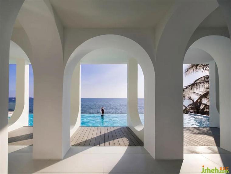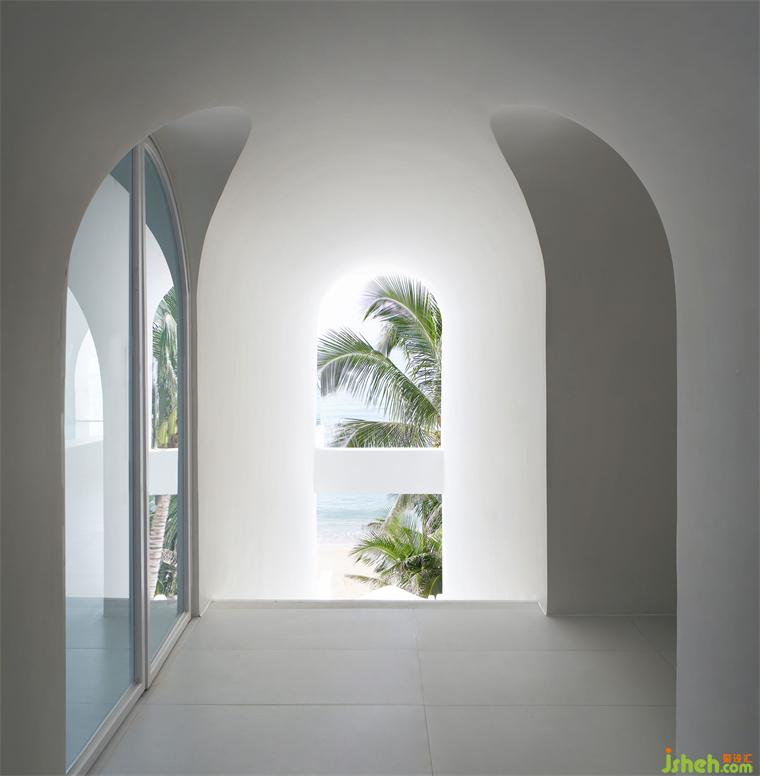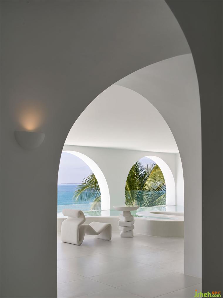 在嚴(yán)格的美學(xué)比例下,藍(lán)天、碧海、沙灘、棕櫚,精品酒店設(shè)計(jì)恰到好處地收錄于圓拱畫(huà)框之中,人的視線(xiàn)在連續(xù)的圓拱中自由穿梭,目之所及處,皆是純白一片,任意一隅定格,皆是生動(dòng)的取景框。