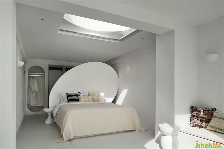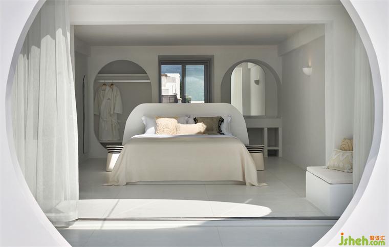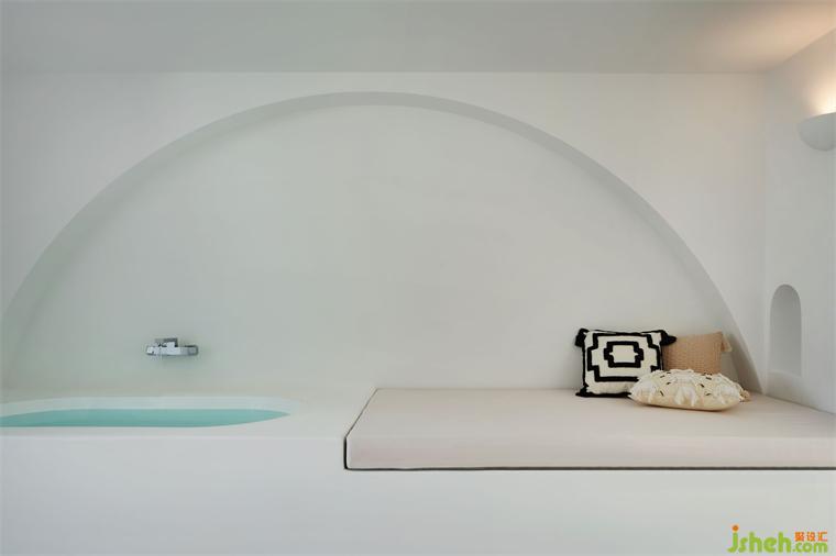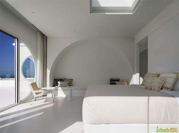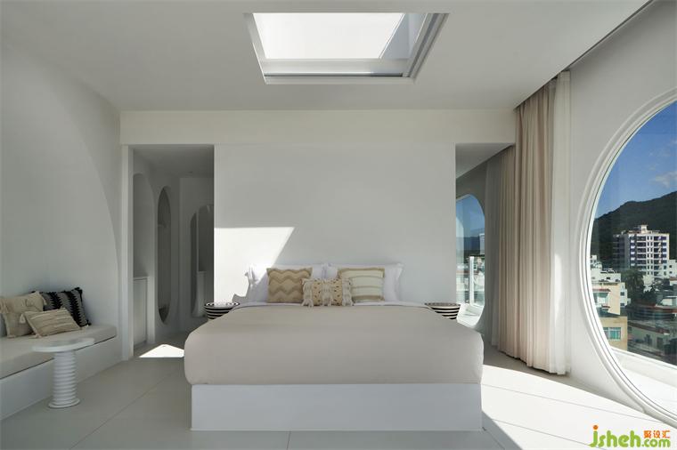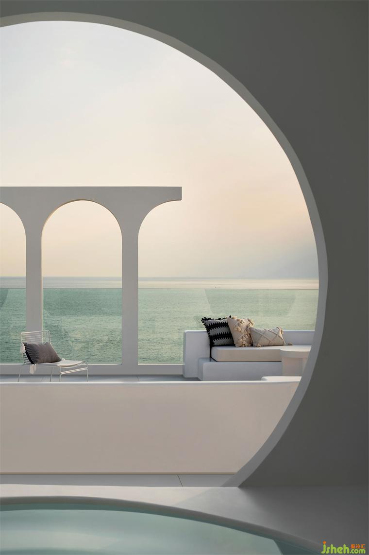 遠(yuǎn)眺靄靄青山,近接茫茫大海,天臺(tái)的視野極度開闊,設(shè)計(jì)師將天臺(tái)的景觀可能性開發(fā)到極致,劃分出休閑觀景、閑坐交流、溫泉泡湯、打卡拍照等多個(gè)美學(xué)場(chǎng)景,讓人仿佛置身希臘米克諾斯島風(fēng)情之中。精品酒店設(shè)計(jì)淺水鋪陳出天空之鏡,石階、下沉式座區(qū)勾勒出秩序,圓拱裝置形構(gòu)出打卡點(diǎn)......在自然與藝術(shù)的結(jié)合中,予人安適舒愜的互動(dòng)場(chǎng)景。