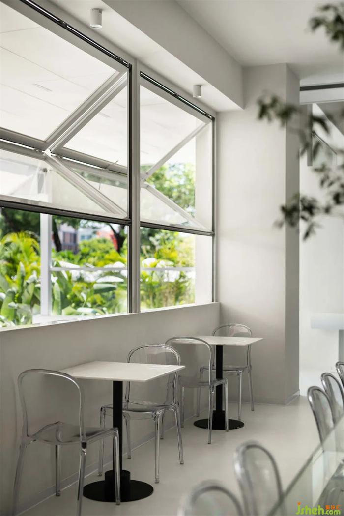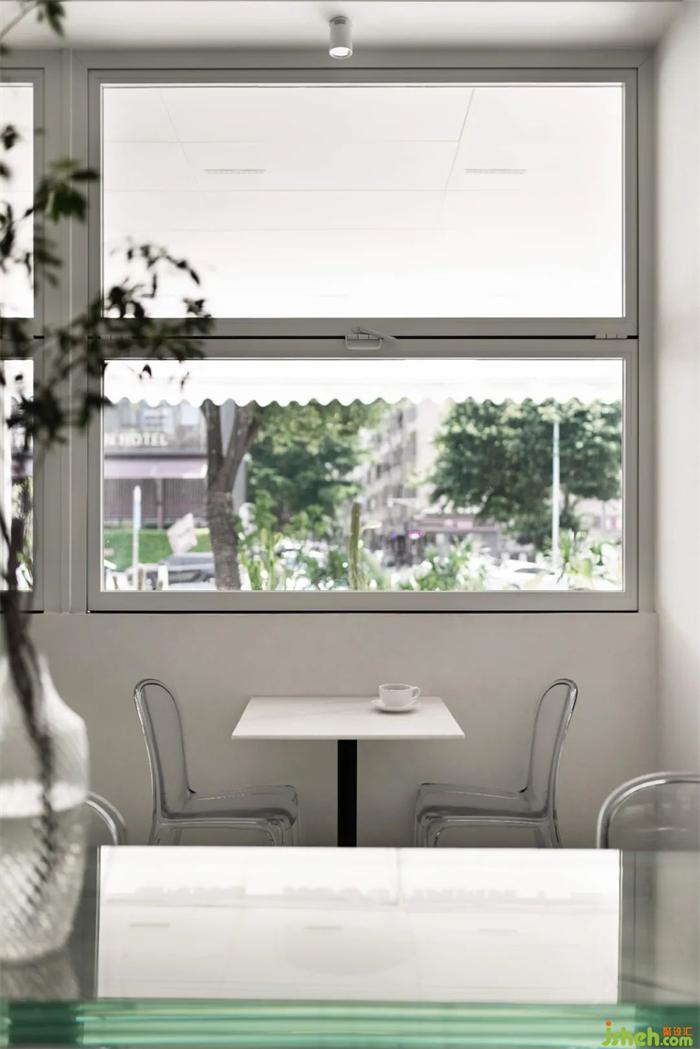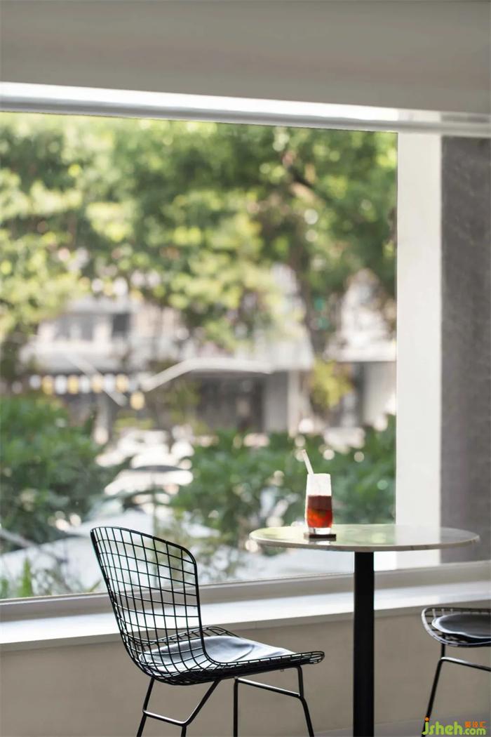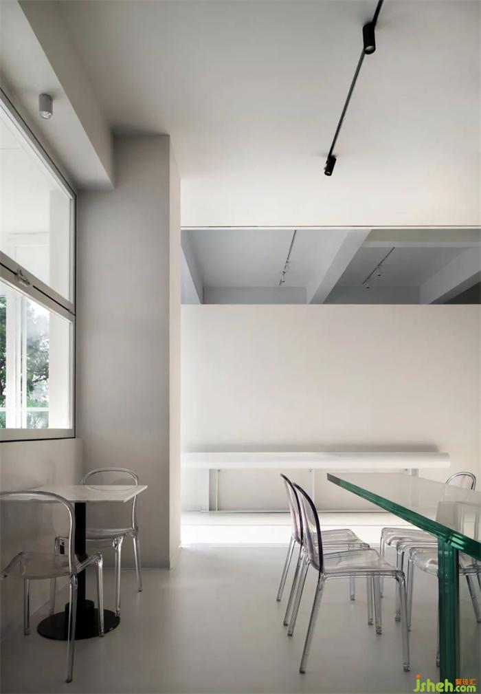 室內(nèi)空間以大面積的白色充斥兩個(gè)方盒空間的嵌套結(jié)合關(guān)系,并通過(guò)高差打造垂直緯度的豐富體驗(yàn)。對(duì)于當(dāng)代都市人群的生活預(yù)設(shè),咖啡不僅代表了一種生活態(tài)度,更是一種工作方式的延續(xù)。餐廳設(shè)計(jì)對(duì)于冗雜工作間的厭倦,使得人們轉(zhuǎn)向?qū)で蟾辛己皿w驗(yàn)的空間。