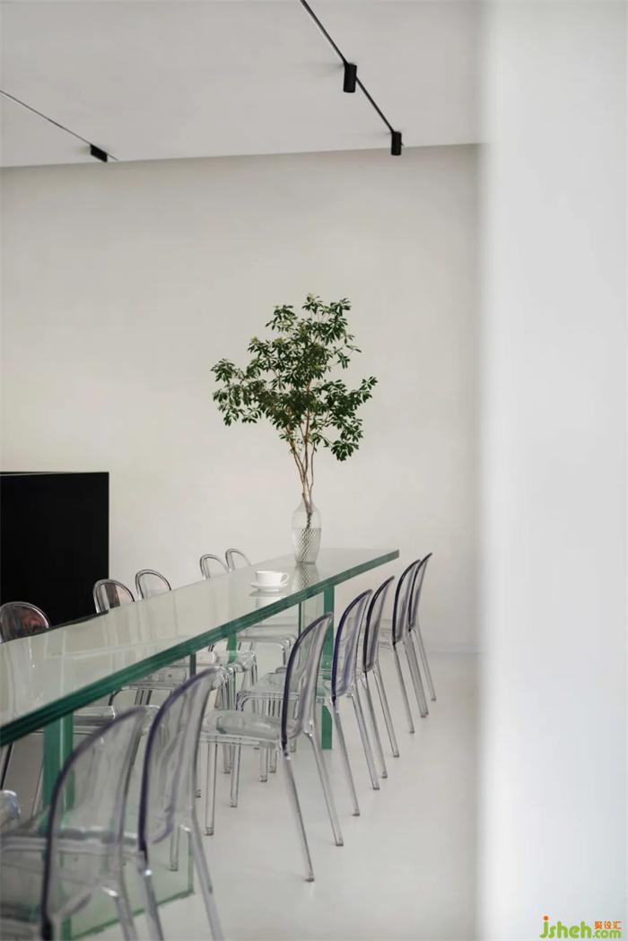 主空間中央的玻璃長(zhǎng)桌,通體透明的硬朗形體透露著工業(yè)時(shí)代的冷峻與嚴(yán)謹(jǐn),味匠咖啡廳設(shè)計(jì)而亞克力椅子的柔和曲線中和了其中的疏離,使得人們共處方式更加開(kāi)放多元。人們可以在這里視頻會(huì)議、活動(dòng)交流,充分表達(dá)自我,聯(lián)通外部世界。