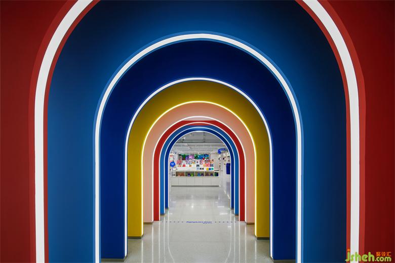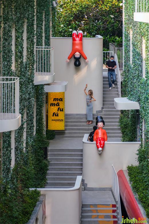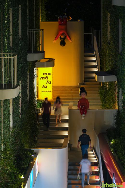 在設(shè)計(jì)者根植于在地文化所營(yíng)造的商業(yè)街區(qū)中,其顛覆了原有街區(qū)的尺度與形態(tài),采用層次化、遞進(jìn)式設(shè)計(jì)讓街區(qū)變得豐富起來(lái)。溯源而上,上海M+馬利 mamǎfufú超級(jí)百貨設(shè)計(jì)者以顏料工廠舊址思索而來(lái)的紅黃藍(lán)三原色靈感,串聯(lián)起了整片街區(qū)。