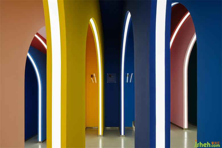 馬賽克磚作為不同的元素被置于洗手間背景處,通過(guò)紅色拱形門(mén)而進(jìn),熱烈的表達(dá)一以貫之。