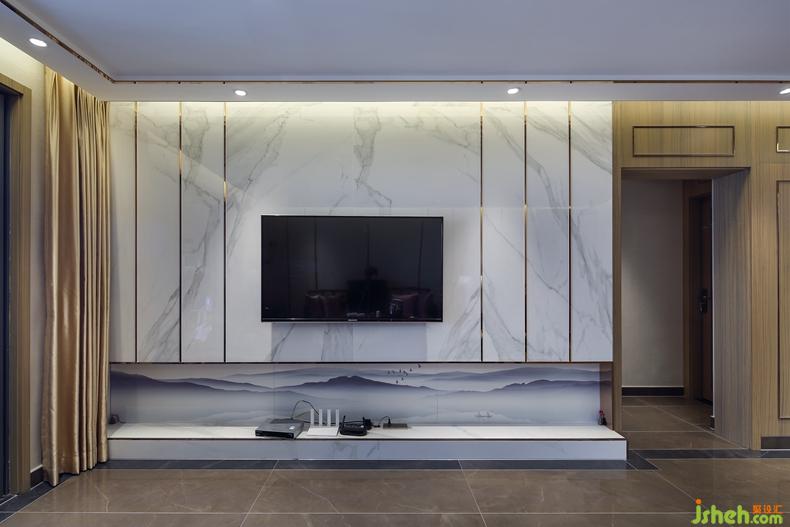 電視背景墻采用爵士白石材,左右兩側(cè)各嵌入三條現(xiàn)在最流行的香檳金色不銹鋼條,再看底下那那副朦朧的山水畫,不禁令人想起一句詩“濃似春云淡似煙”聊到這副畫,業(yè)主甚是滿意,贊不絕口,用刺繡繡于絲綢之上再印到陶瓷上,既可能保留原畫的韻色意境又能增添絲綢的細(xì)膩飄逸質(zhì)感,再加上刺繡的一針一線的細(xì)節(jié)展現(xiàn),實在是一副不可多得的好作品。