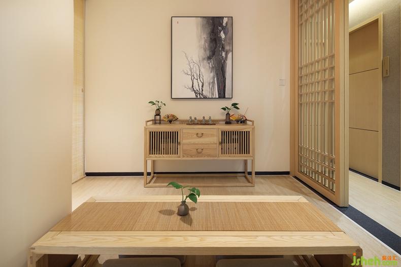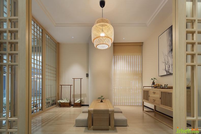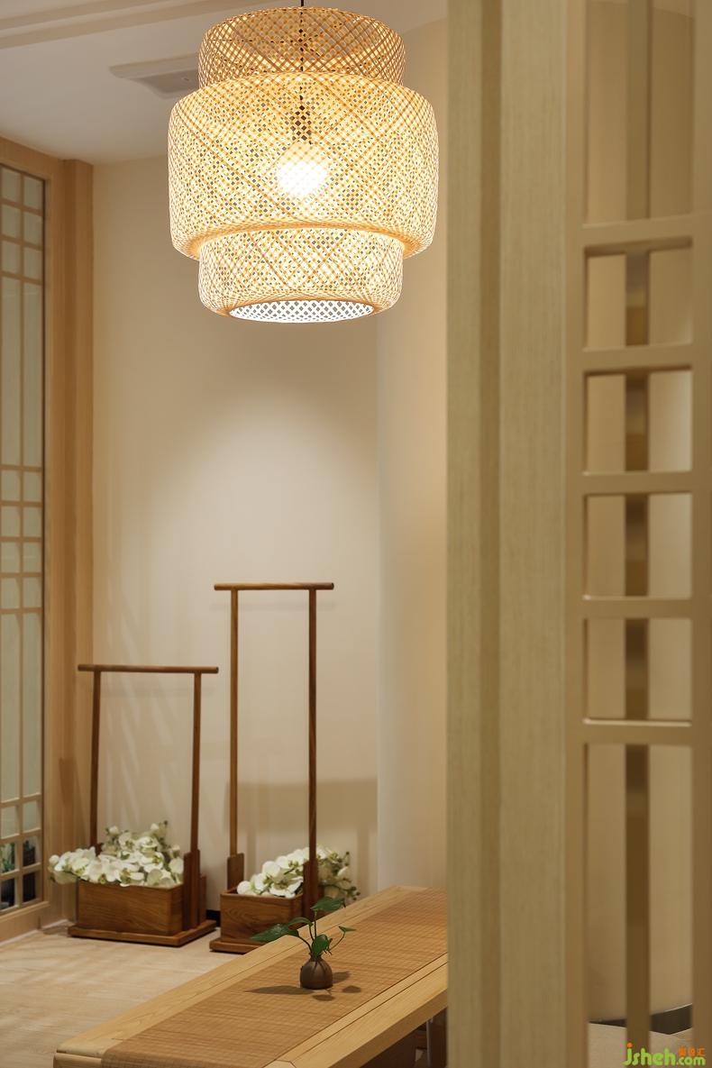 竹編燈籠外形的吊燈、和風矮木桌、舒軟棉麻榻榻米、角落處是兩個古色古香的木制方形花籃,一大一小一高一低,深圳室內設計師藝術感非常強烈,靜態(tài)的畫面里,卻又有了動態(tài)的活力。
