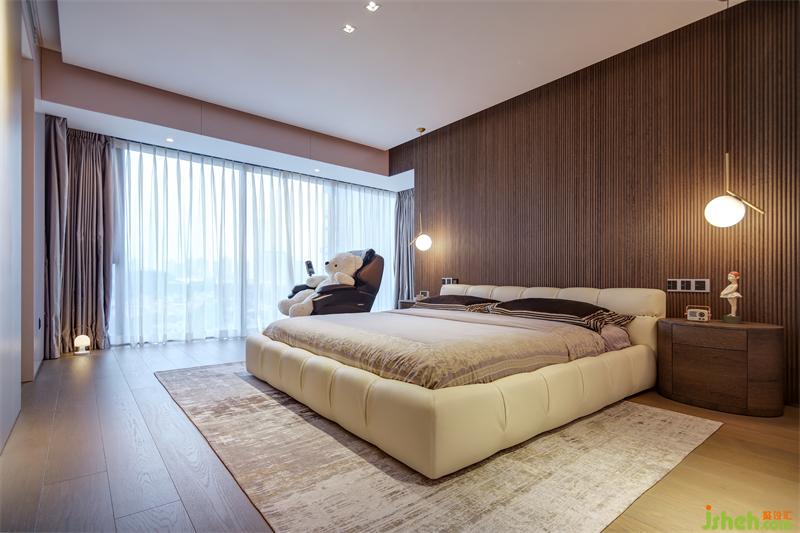 主臥延續(xù)客廳的黑白灰棕主色調(diào),但采用了更加溫暖的配色。設(shè)計(jì)全景落地窗讓視角更加開(kāi)闊,希望幫助主人在忙碌生活中調(diào)劑心情。