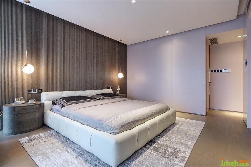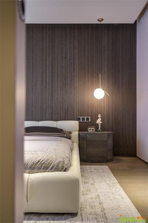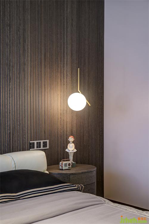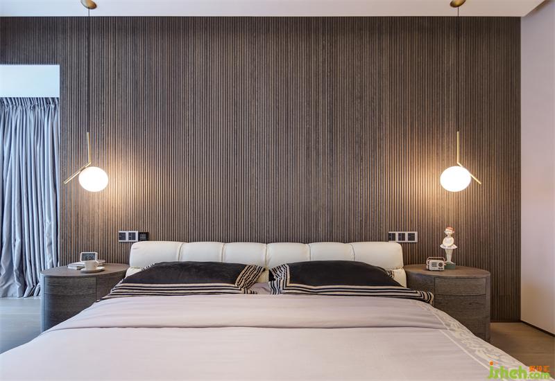 黑灰色細(xì)條紋酸枝木貼面墻前對(duì)稱(chēng)的窗前吊燈及床頭柜配色統(tǒng)一而不乏味,球形吊燈適用臥室柔和的整體氛圍需求,雙聯(lián)開(kāi)關(guān)設(shè)計(jì)避免了主人日常起居不必要的麻煩。