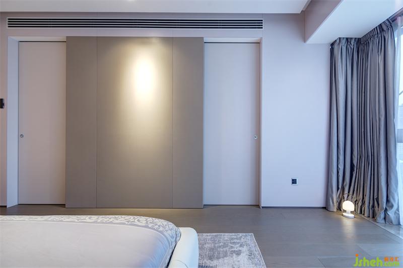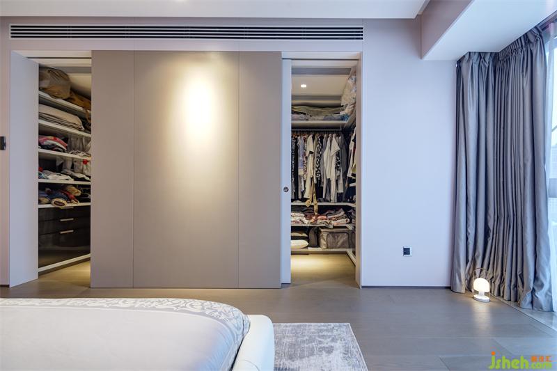 衣帽間直接連接主臥,設(shè)計(jì)隱藏式推拉門(mén)分隔臥室和衣帽間,三面環(huán)繞的儲(chǔ)物柜便利了主人的每日穿搭,也為主人的服飾、箱包及床品等生活用品提供了儲(chǔ)存空間。