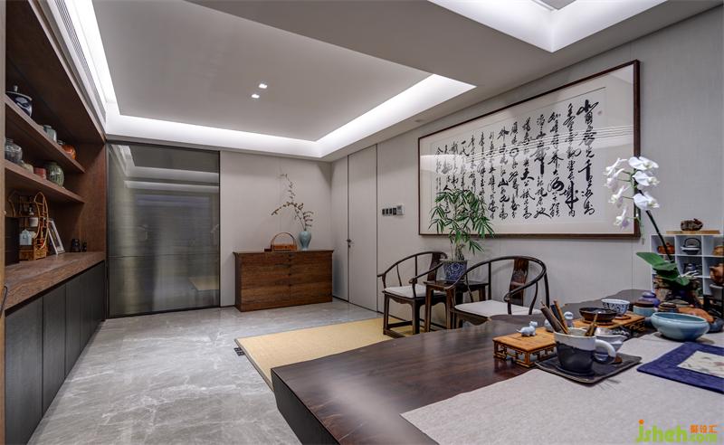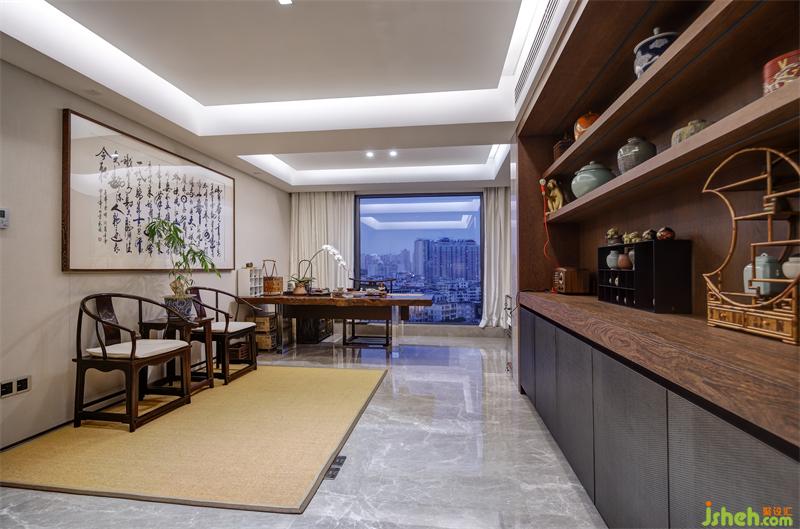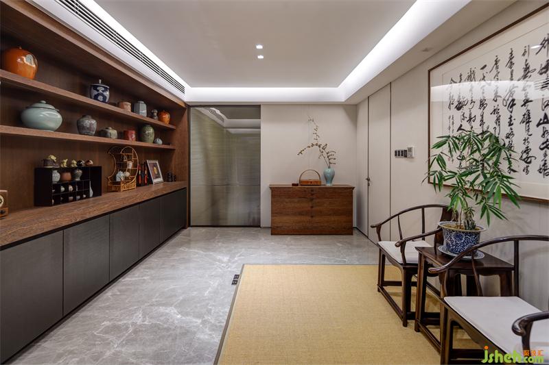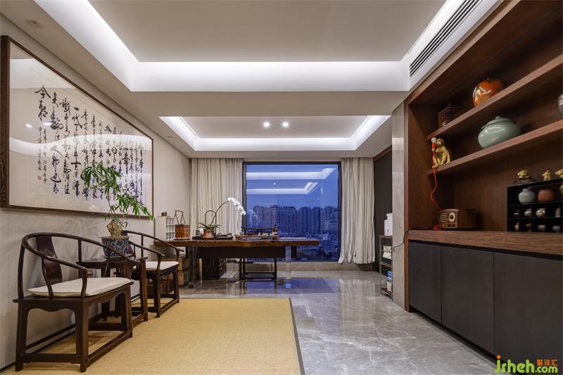 拉絲玻璃作為茶室與走廊的隔斷既保證了隱蔽性又不顯拘束,茶室內(nèi)大面積采用草木元素,適應(yīng)書(shū)房的整體調(diào)性。設(shè)計(jì)師在一側(cè)墻面設(shè)計(jì)展示柜,希望將業(yè)主的各式工藝收藏品得以展示,與對(duì)側(cè)墻面懸掛的大幅書(shū)遙相呼應(yīng),彰顯主人品味。草編地毯上的檀木太師桌椅與落地窗前的寫(xiě)字桌適合主人伏案工作,也適合與三兩客人商談閑聊。