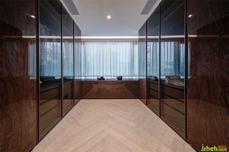 臥室的入口邊設(shè)有步入式衣帽化妝間,不僅滿足了女主人的梳妝需求,不同規(guī)格的儲物空間還能將各種衣物分類收納,整體規(guī)劃完美的提高了空間使用率。
