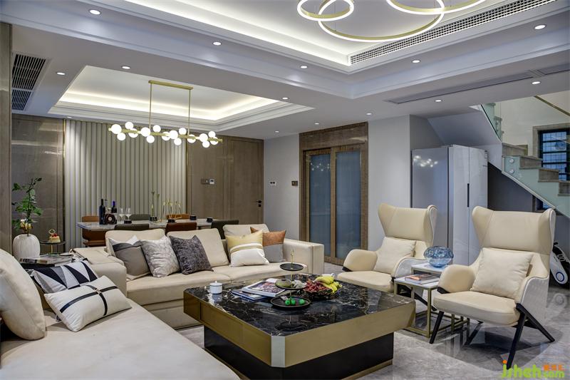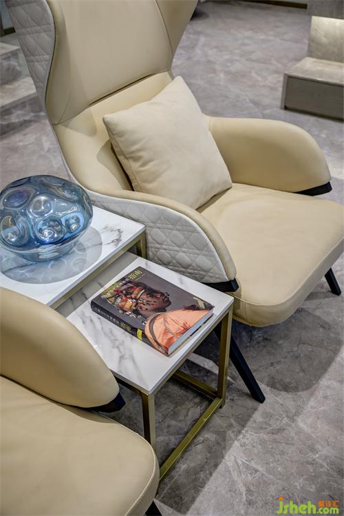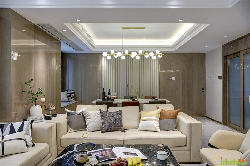 客廳區(qū)域,我們以偏暖色的卡其色為基調(diào),黃棕色作為點綴色,沖撞出微妙的美感?,F(xiàn)代輕奢設(shè)計造型上“理性”的運用線條,僅從水平和垂直角度去詮釋現(xiàn)代輕奢藝術(shù),石材以及簡約的吊燈,顯得不那么平庸與造型融為一體。