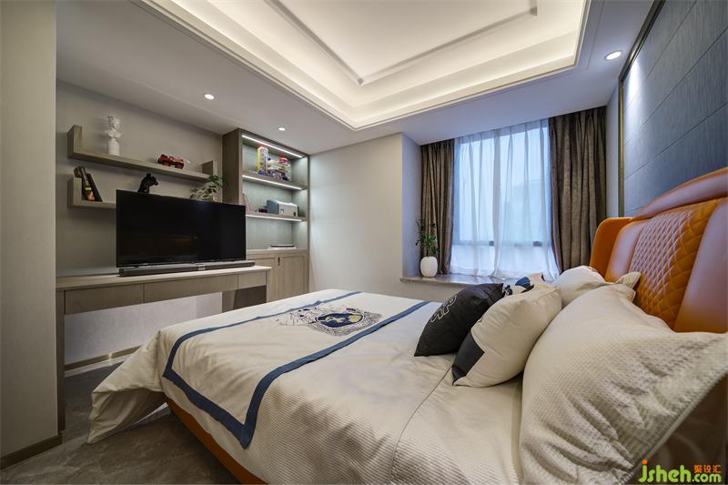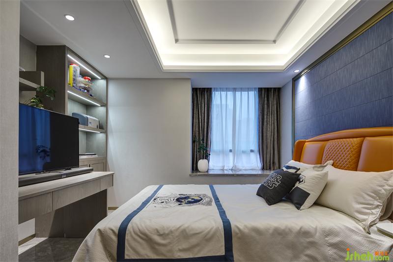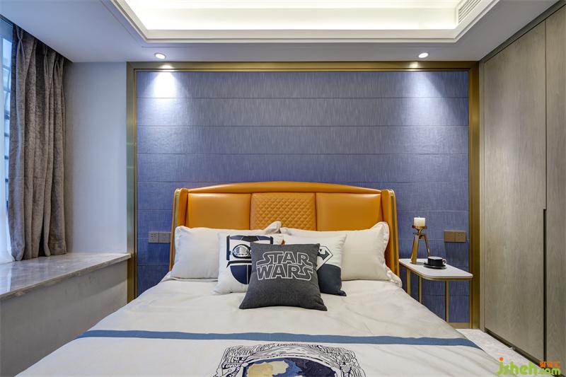 床頭采用愛馬仕橙,有著黃色的明媚,紅色的艷麗,就像灑在海面的陽光,現(xiàn)代輕奢設(shè)計酸酸甜甜的橘子一般,視覺感超級暖心,背景墻采用灰藍(lán)色,給人一種面朝大海的清新。