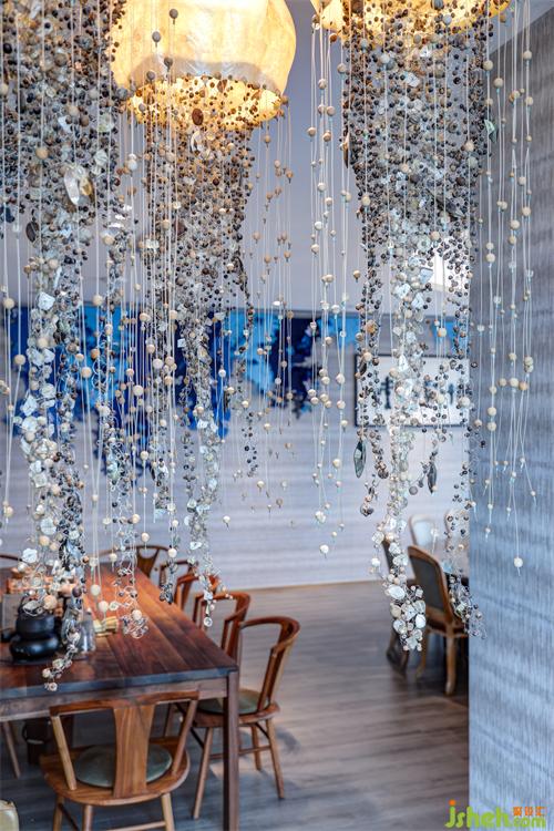 水母的尾巴,用石頭、水晶、貝殼等物串成,在燈光下一閃一閃,搖搖擺擺,唯美而迷人。