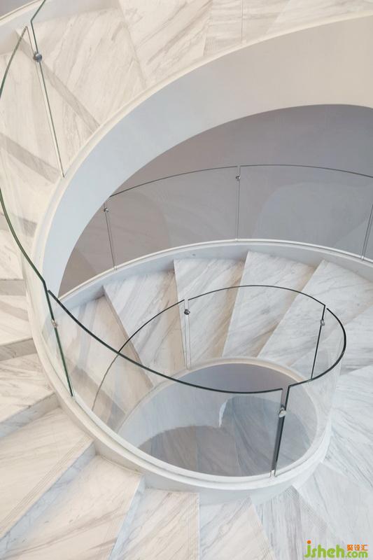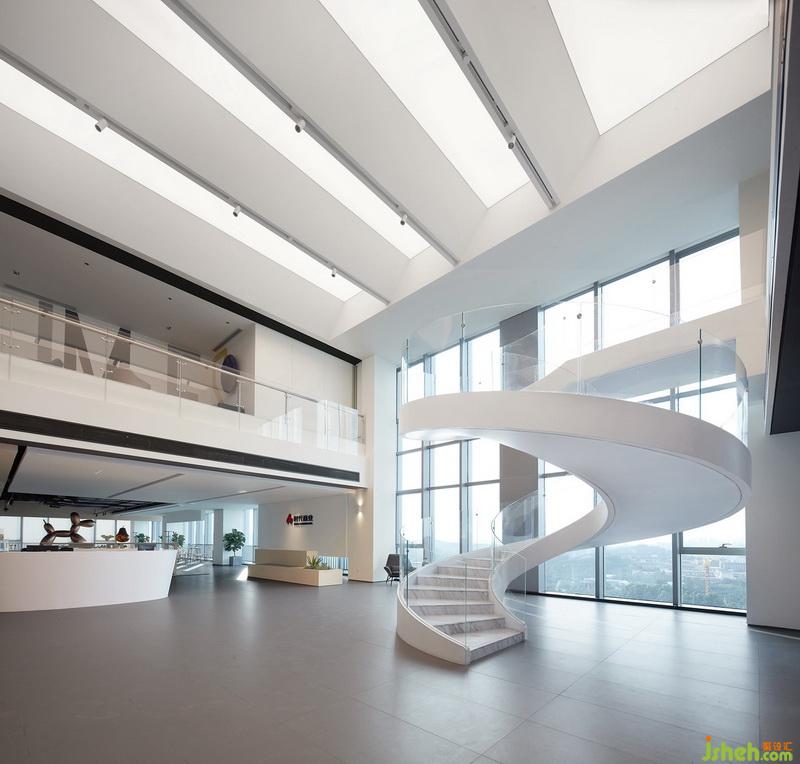 室內(nèi)設(shè)計師在考慮平面時,以中庭為一個隔,樓上辦公,樓下會客,同時樓下又將展示區(qū)和商務(wù)休閑區(qū)隔開。大面積的落地窗讓人遠(yuǎn)眺窗外翠綠天際,頂面光棚如天光泄下,色調(diào)則以由亮入暗的對比形成帶有舒緩氣質(zhì)的節(jié)奏,使空間的功能劃分單純化,也為來者在不同的功能區(qū)提供相應(yīng)的心理鋪墊。