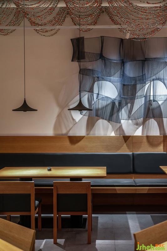 只有“農(nóng)居”的概念,還不足以體現(xiàn)南方的鄉(xiāng)村狀態(tài)。沒有水,“桃花流水鱖魚肥”、“舴艋為家西復(fù)東”這些“水鄉(xiāng)”的意味就完全無法表達(dá)。在本就不大的營業(yè)面積里做出一片水,不講這種“論畫以形似”,以實對實的效果是否能如人意,在寸土寸金的商業(yè)空間內(nèi),業(yè)主大概也不會同意。因此設(shè)計師采取“意象”的方式,以創(chuàng)作的裝飾藝術(shù)品作表達(dá),用金屬和塑料這類工業(yè)化的產(chǎn)品重新建構(gòu)農(nóng)業(yè)社會的記憶。它帶有一種無可奈何的諷刺的意味。