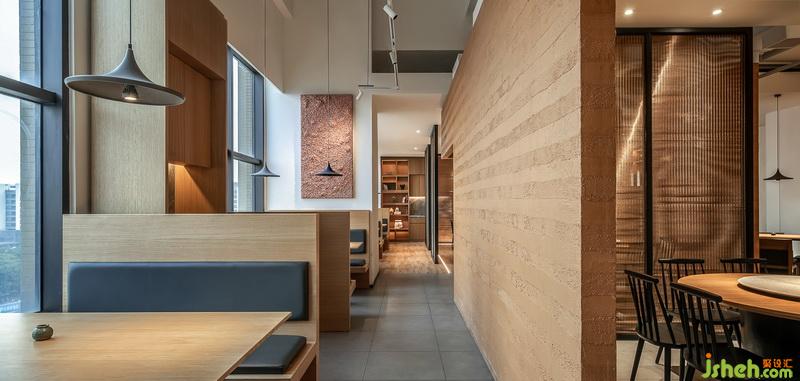 南方鄉(xiāng)下在普通人心理層面形成的印象是什么?當(dāng)然是“潤”。去過南方鄉(xiāng)下的人,一定見過那些用版筑的方式制成泥磚后最常見又最廉價的農(nóng)居。設(shè)計師以此作為空間的材料基點,讓色調(diào)與肌理形成有內(nèi)在聯(lián)系的呼應(yīng),在都市中帶入農(nóng)居的概念。