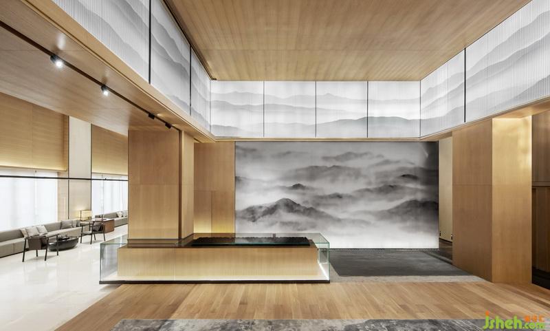 主要材料:木飾面、透光膜、米黃色石材、深灰色不銹鋼、深灰色鋁單板