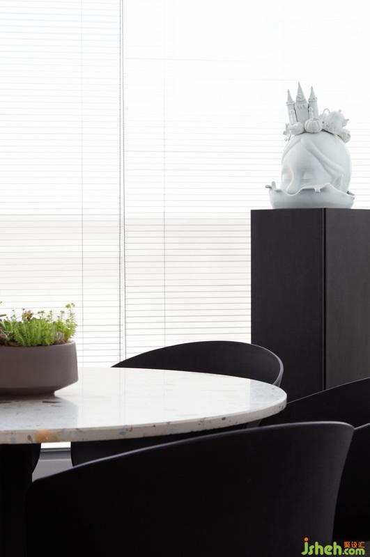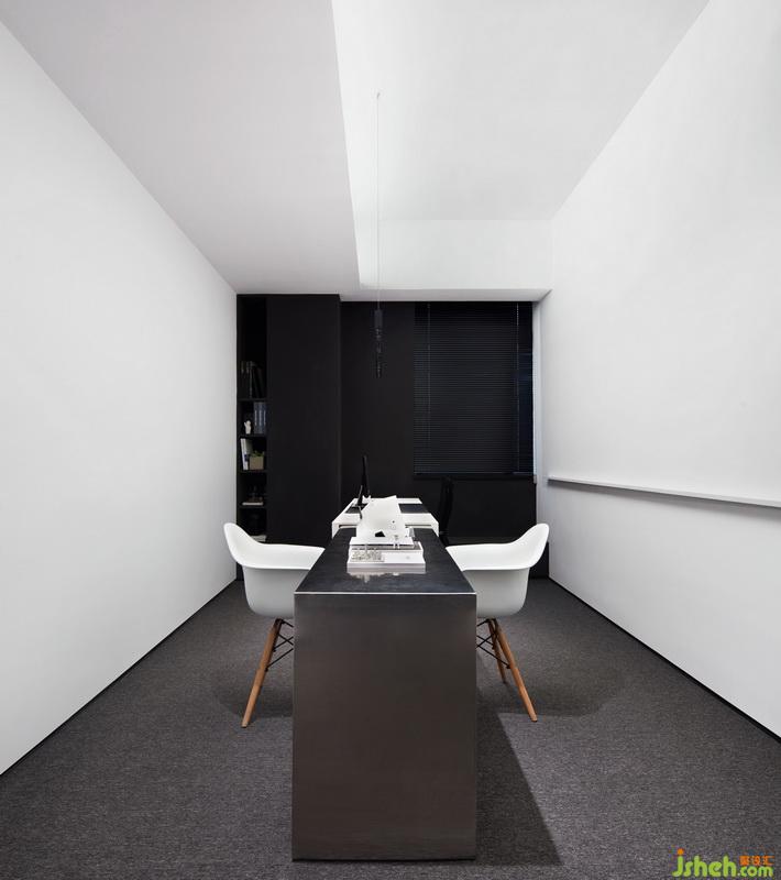作為辦公空間前區(qū)(公共區(qū)域)的設(shè)計(jì),設(shè)計(jì)師在空間中置入了一個向四面伸展的爆炸形裝置,如同一個多個方向的漏斗,連接著各個不同的功能空間,成為交通核的同時又為各個空間提供釆光與通風(fēng)。傾斜的黑白構(gòu)圖打破一些平衡,形成一些視錯覺,活躍了空間氣氛。
