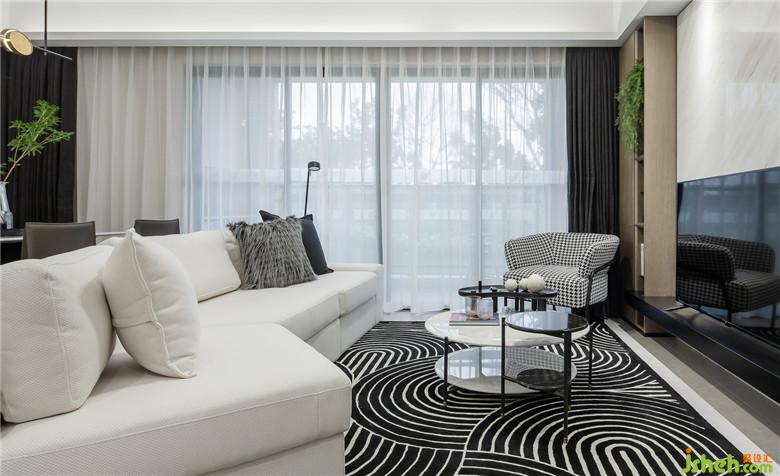 作為這三套樣板間中面積最大的一個,空間以深淺不一的灰與白作為基調,線條明朗而直接。軟裝通過線條的改變來打破空間原有的穩(wěn)定,弧形圍合的茶幾,不規(guī)則的沙發(fā),與大面積圓形交錯的黑白地毯,碰撞出一種微妙的平衡感,斂去了方正空間的沉悶。