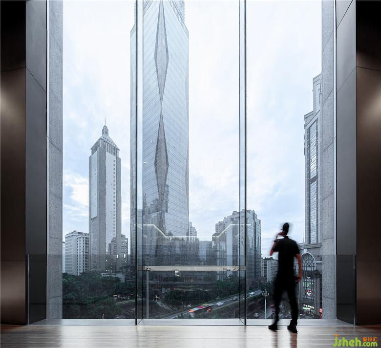 透過通透玻璃幕墻,這塊獨(dú)特的空間被向外進(jìn)一步延伸,與自然環(huán)境之間有了更深刻的關(guān)聯(lián)。由內(nèi)向外望去,它像在隔絕空間里被注入的一次深呼吸;而站在大廈之外,它就像是一個鑲嵌在空中的巨大櫥窗,在溫暖的燈光的映襯下,猶如這座屹立了20年的建筑終于向城市打開了自己的內(nèi)心世界。