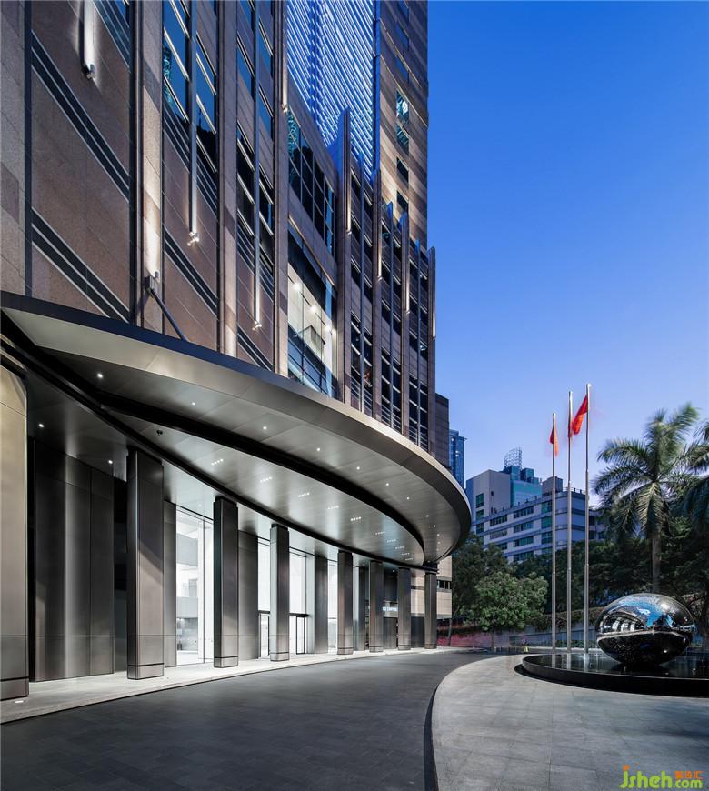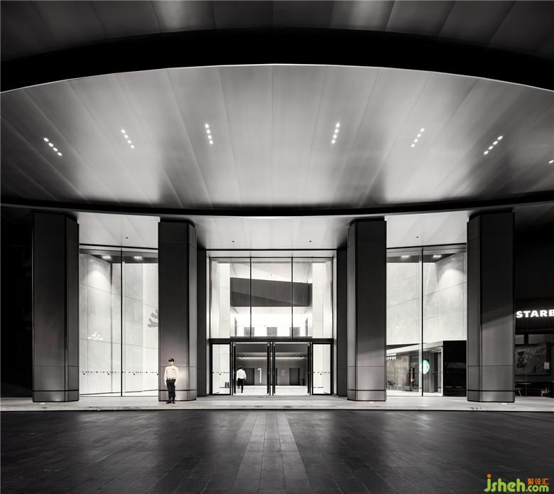 立柱之上雨篷則被重新設(shè)計(jì),簡(jiǎn)潔的弧形結(jié)構(gòu)替代了原本的玻璃雨篷,結(jié)構(gòu)的簡(jiǎn)化讓它與大廈主體間的銜接更加自然,融為整體。同時(shí),半圓弧形結(jié)構(gòu)向兩側(cè)的自然延伸帶來(lái)了更多的覆蓋面,為遮擋功能帶來(lái)提升。