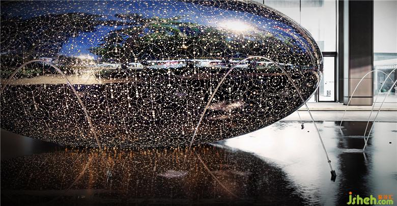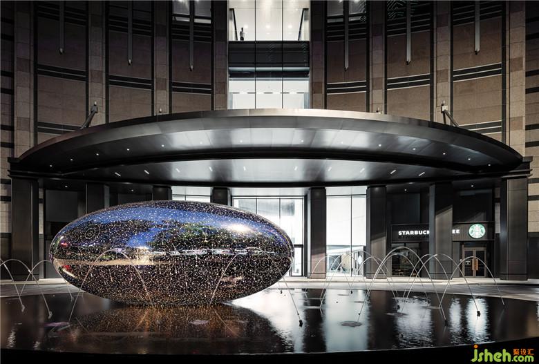 一樓大堂門(mén)前的巨蛋雕塑,源自藝術(shù)家Lindy Lee,6米不銹鋼材質(zhì)的體量感,不容忽視,通體布滿(mǎn)細(xì)小的孔,黑暗中,它們會(huì)穿透蛋殼,投射出星辰般的光芒,讓人看到有無(wú)限的能量在迸發(fā)。如果說(shuō)這棟大廈曾是一個(gè)過(guò)往的城市象征,那經(jīng)歷過(guò)重塑后的它,應(yīng)當(dāng)是“孕育”在蛋殼的一束光芒,繼續(xù)點(diǎn)亮門(mén)前這條大道。