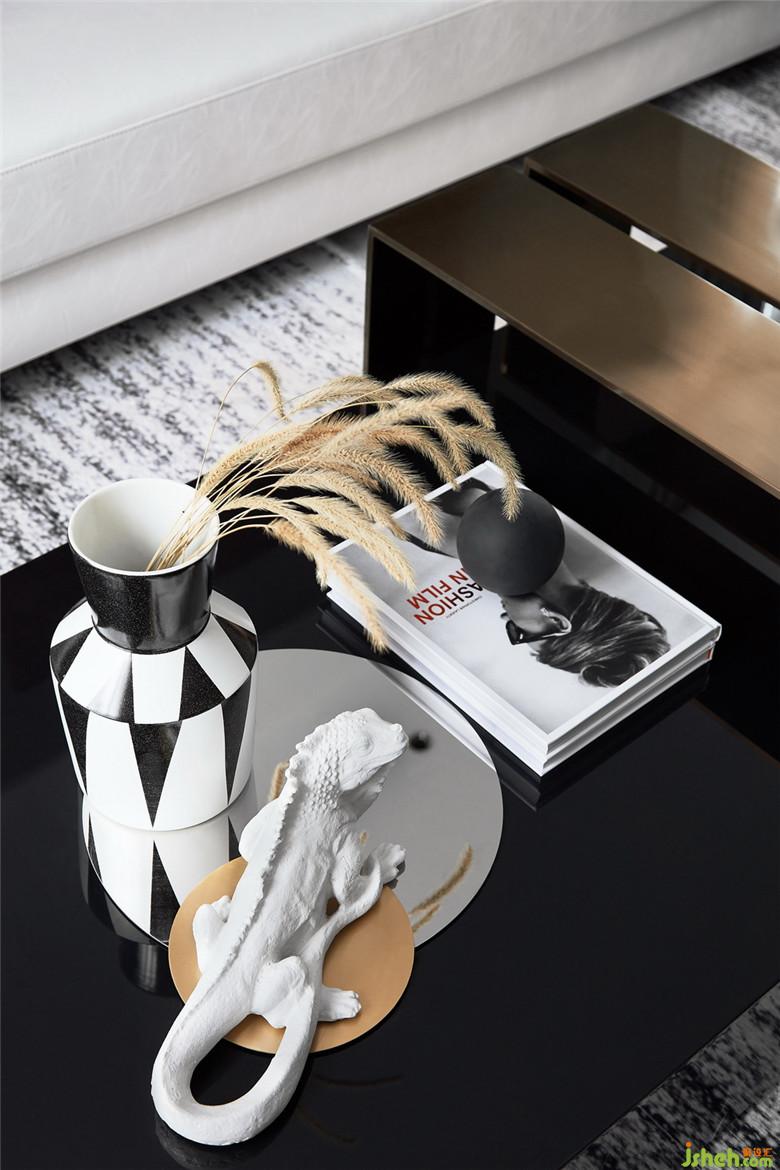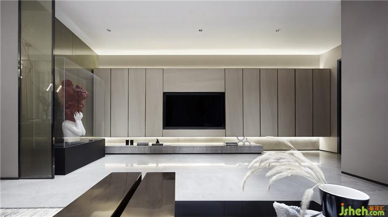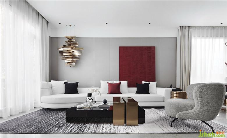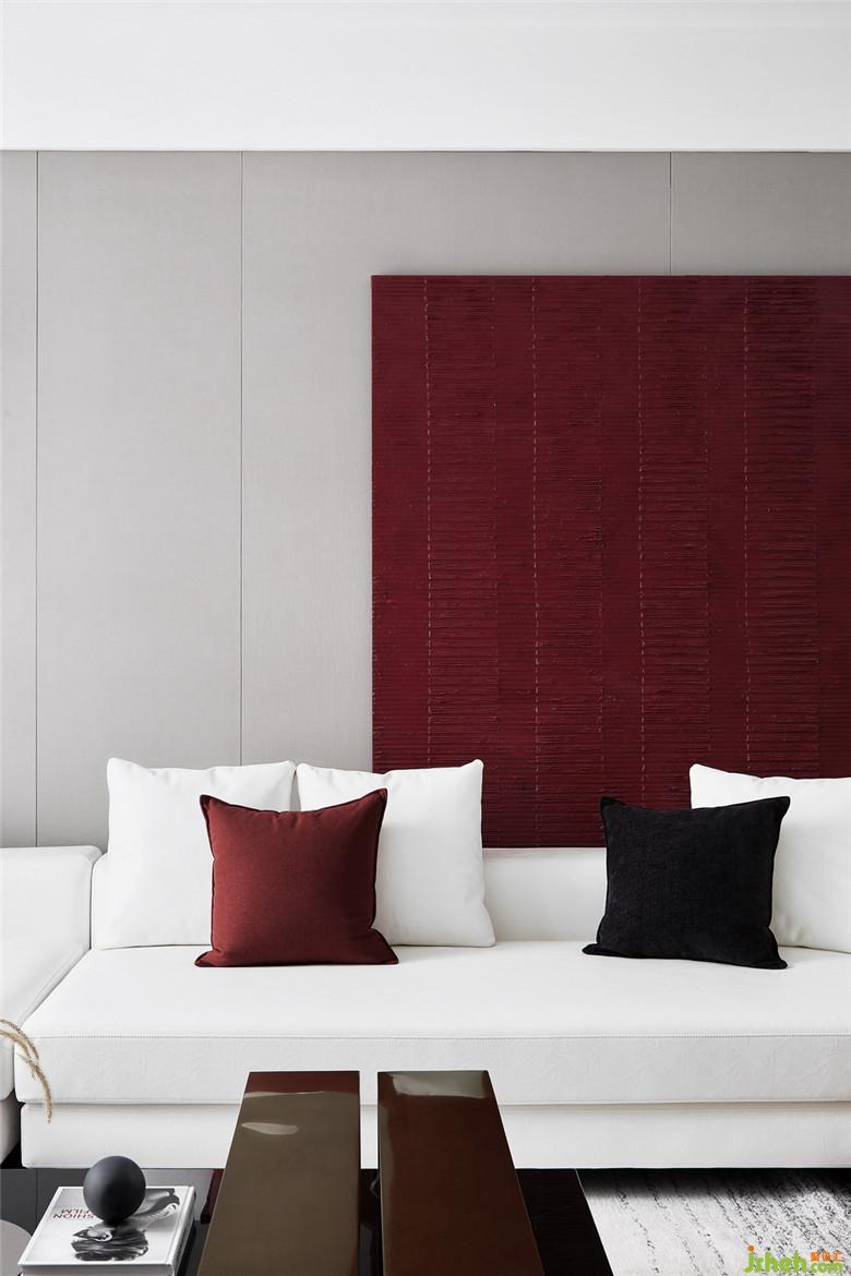 濃烈的紅以不同的材質導入,貫穿于客餐廳的不同塊面,不同灰度的黑與白,用肌理感強烈的棉麻、絨布材質間序其中,金屬的光澤以線條的形式介入。