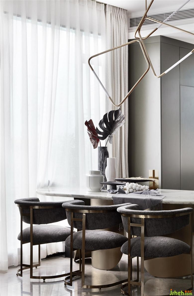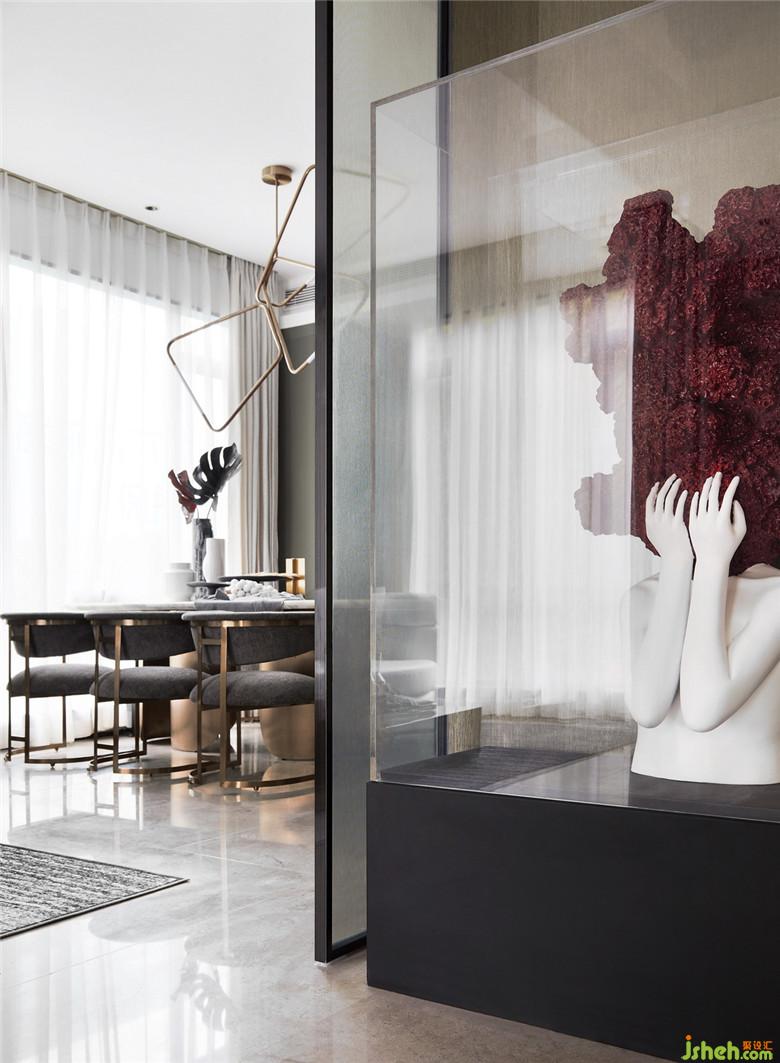 餐廳打破常規(guī),藝術(shù)化的器皿和花藝替代餐具,與不規(guī)則的金屬框相互呼應,鏈接起了空間的藝術(shù)性。