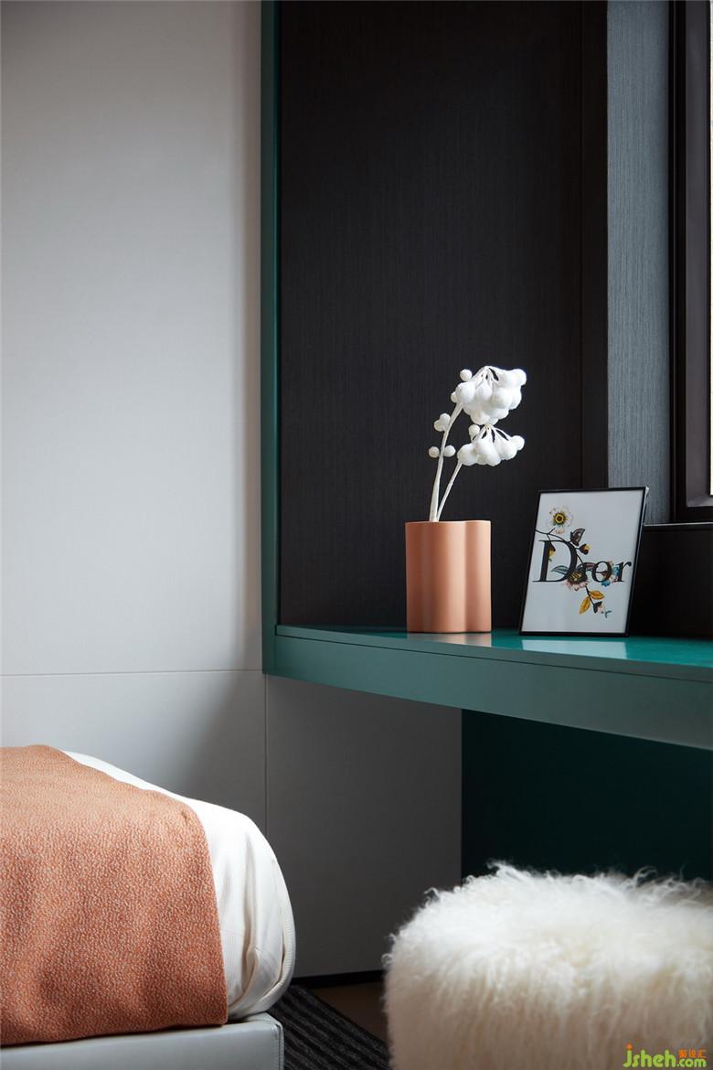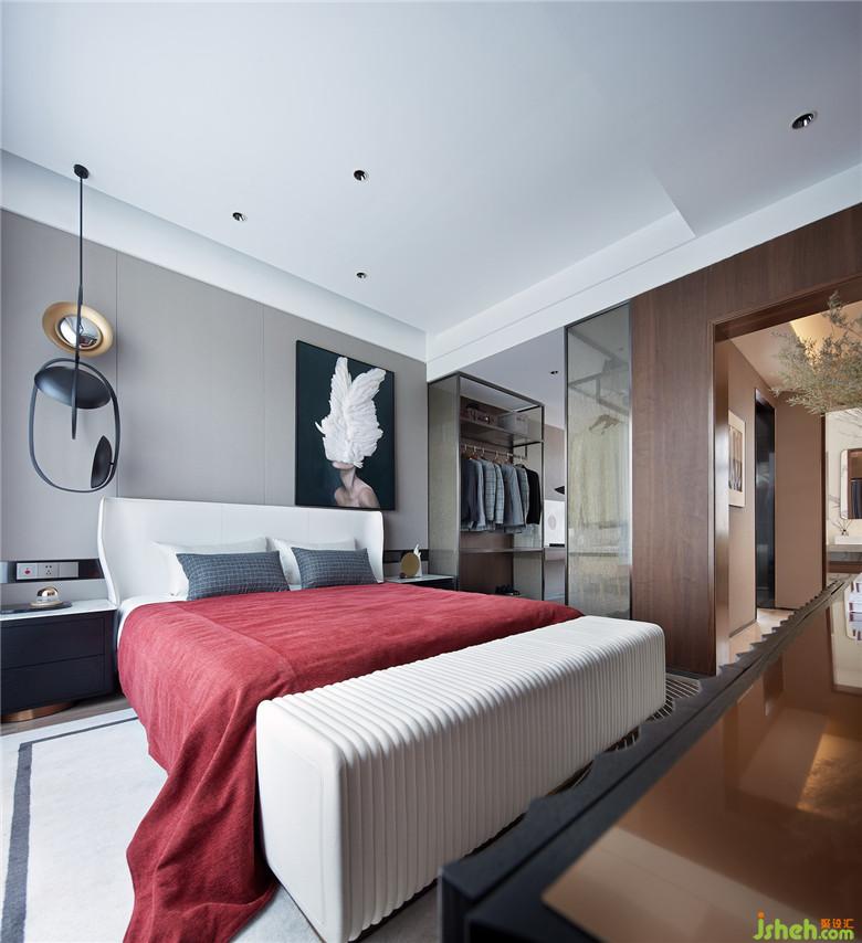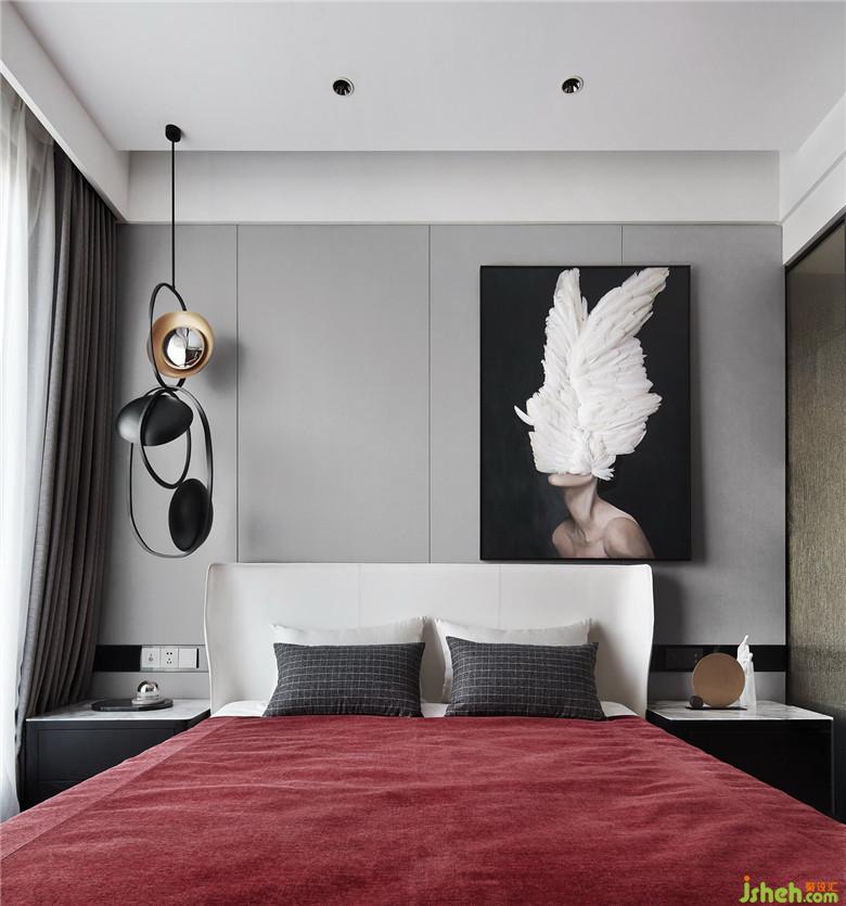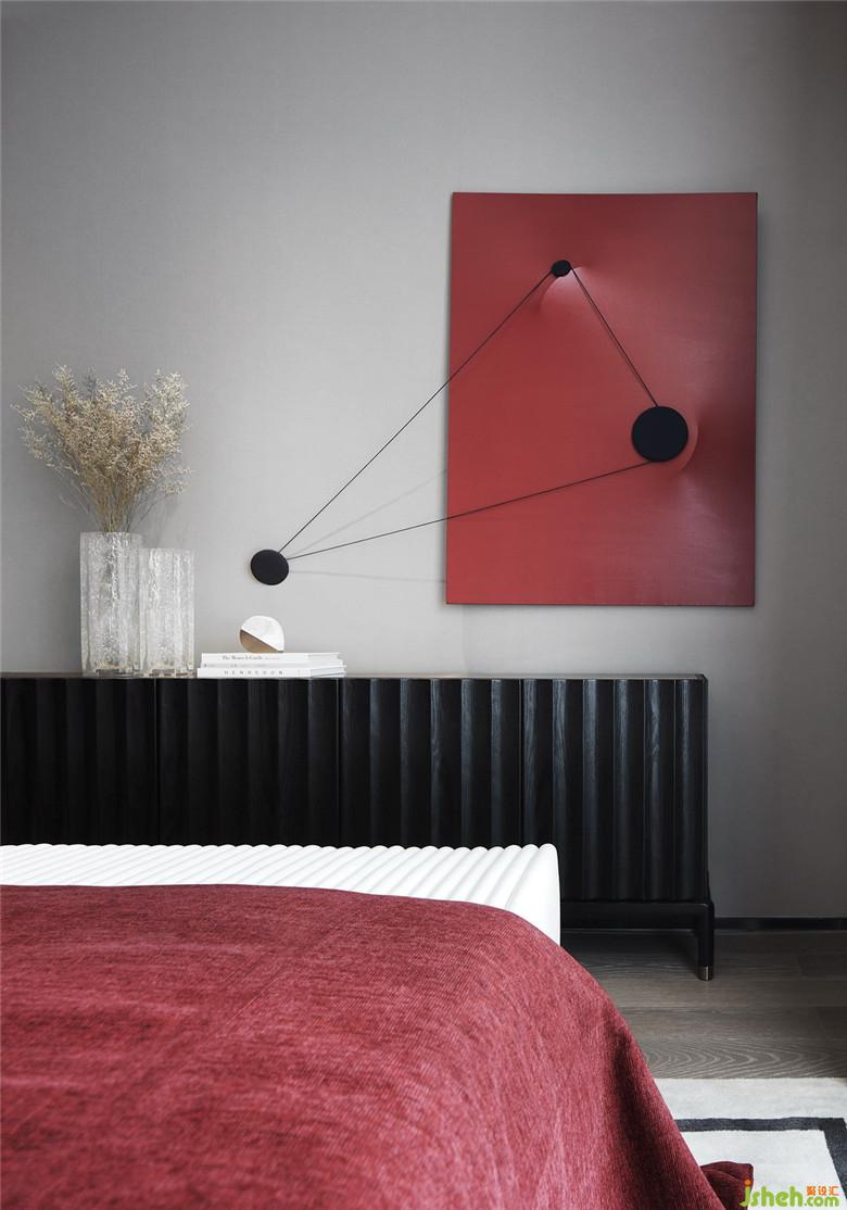 設(shè)計(jì)通過(guò)色彩的變化營(yíng)造私密感,濃烈的紅色在此再次被強(qiáng)調(diào),肌理感被體現(xiàn)在邊柜的黑色木質(zhì)紋理、床品乃至掛畫上手工鑲綴的羽毛。