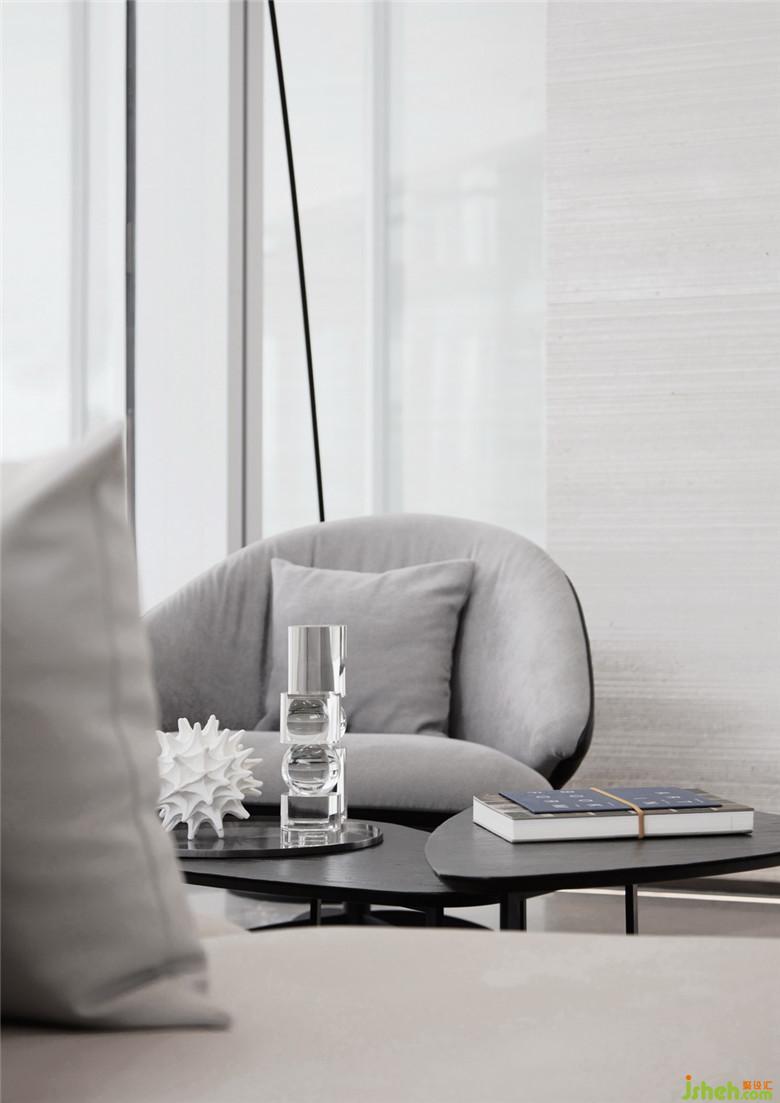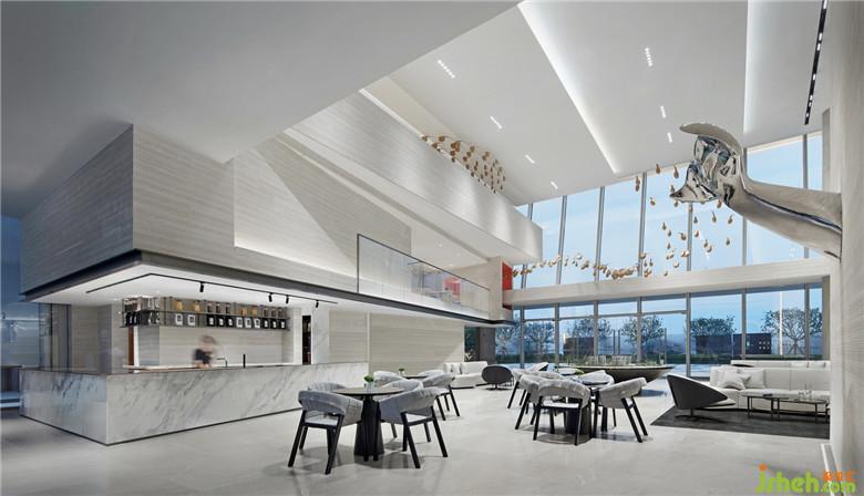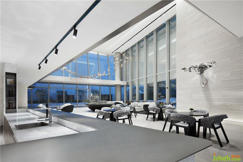 延續(xù)建筑輕盈、現(xiàn)代的語匯,設計以“海、天、云”這種在地的自然形態(tài)作為出發(fā)點,在空間內(nèi)部運用堆砌、切割、錯置空間體塊等內(nèi)建筑概念手法,切入簡潔而富有創(chuàng)造性的輕盈體塊,在線條與體面關系上不撕裂建筑形態(tài)的基礎上,將建筑舒緩地延伸進室內(nèi)。原質(zhì)材料的白與輕度灰金屬在不同的光線變化中表達出“海、天、云”的情態(tài)關系,從而形成建立整個空間秩序的設計線索。