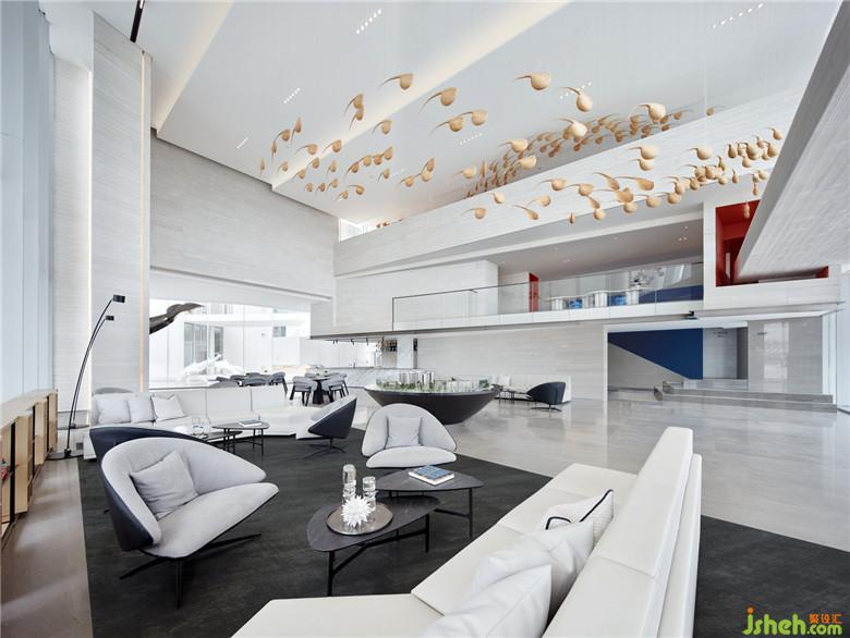 在此基礎上,軟裝增加了相對具象的藝術造型加強空間對心理層面的暗示,同時回應陽江海濱城市的地域特性——游動的魚群,從情態(tài)上既意味著海洋,賦予了空間一種“活”的體態(tài),也是空間動線流向的一種指引。大型海豚及海浪造型裝置的安排,則釋放出影響參觀人士應有的氣定神閑,悠游的意味。