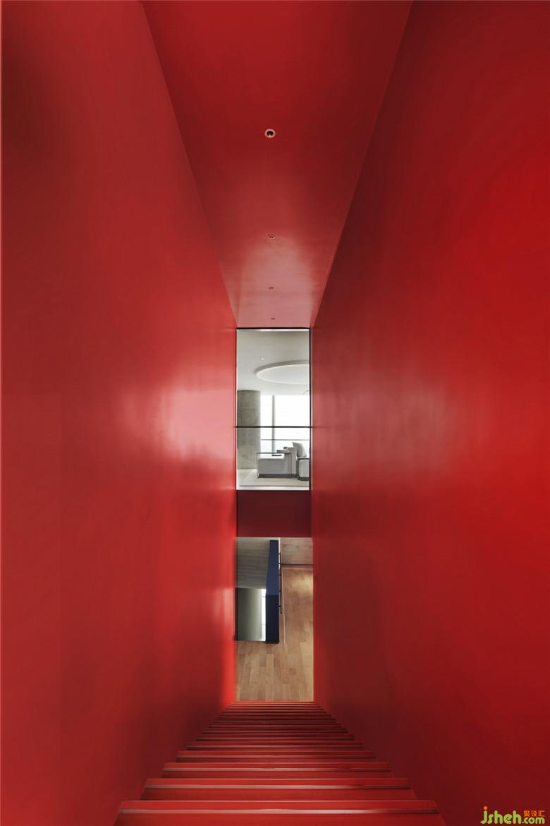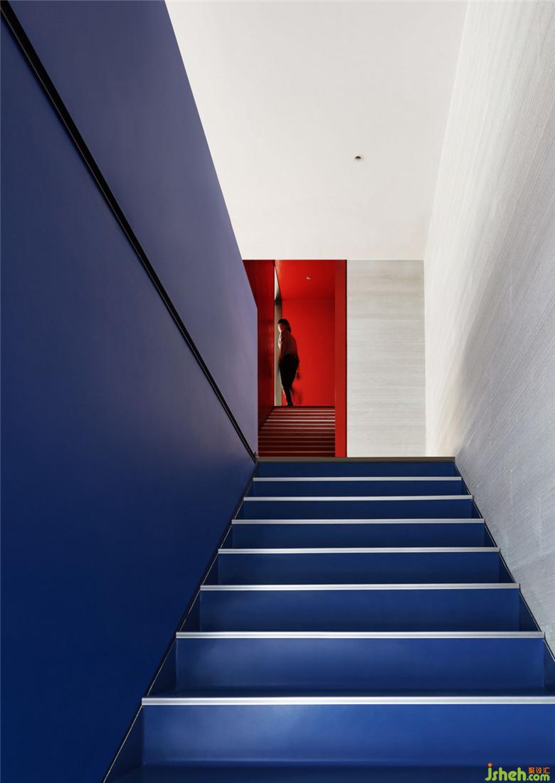 在二層洽談區(qū),我們通過增加夾層樓梯空間連接了三層的兒童活動區(qū)與咖啡吧,并與開放式的戶外屋頂結(jié)構一同作為一種開放式櫥窗形態(tài)展示給來者。同時,為平衡空間整體灰白主色調(diào)營造的過于空曠的觀感,在二層及三層的多個區(qū)域,我們以獨立的大塊面紅、藍原色作為空間調(diào)節(jié),通過墻體前后塊面的錯落與色彩搭配,使空間層次得到豐富。