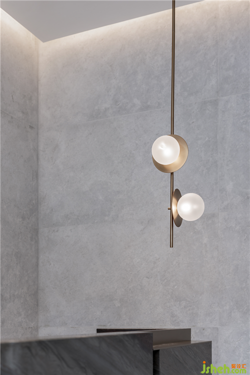主要材料:奧地利灰大理石、藍(lán)色烤漆板、古銅色不銹鋼、藝術(shù)玻璃、實(shí)木