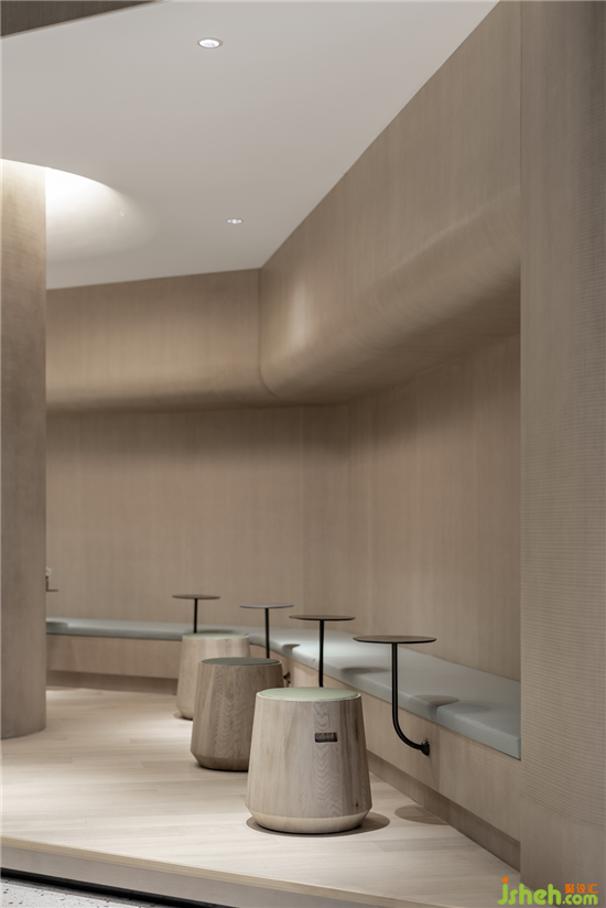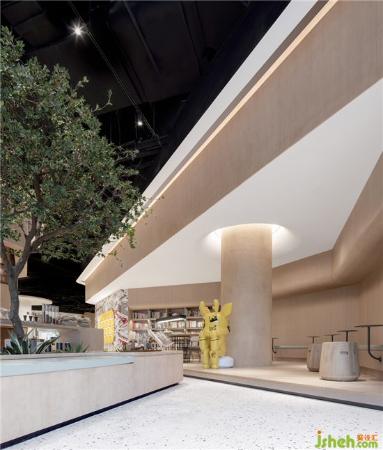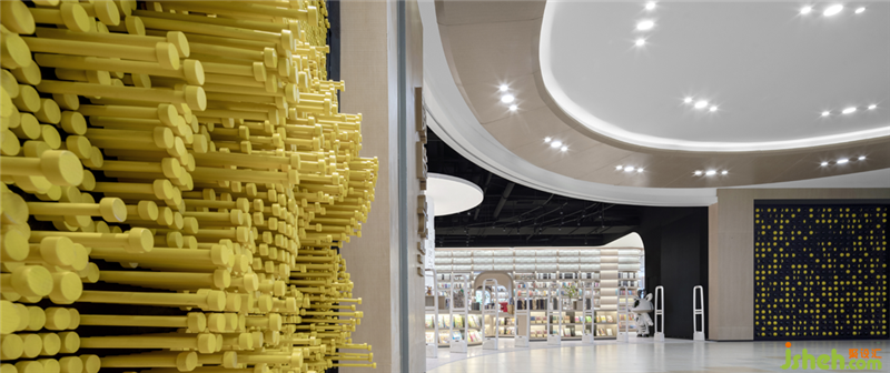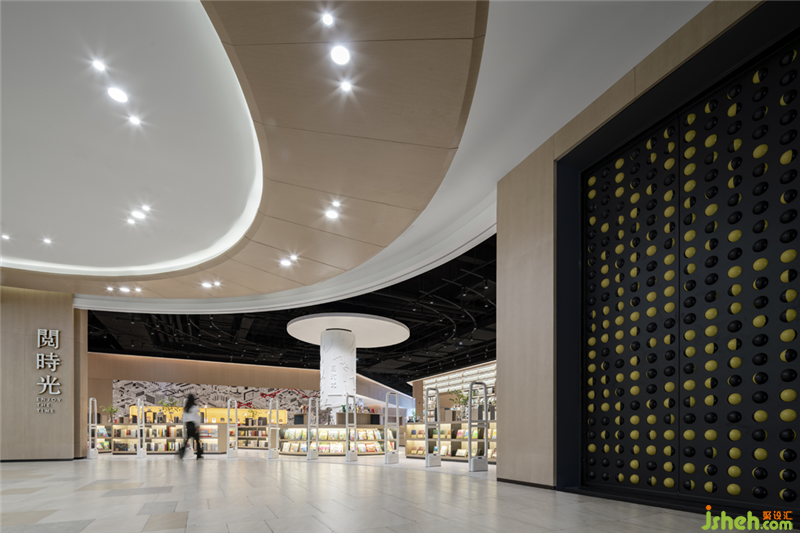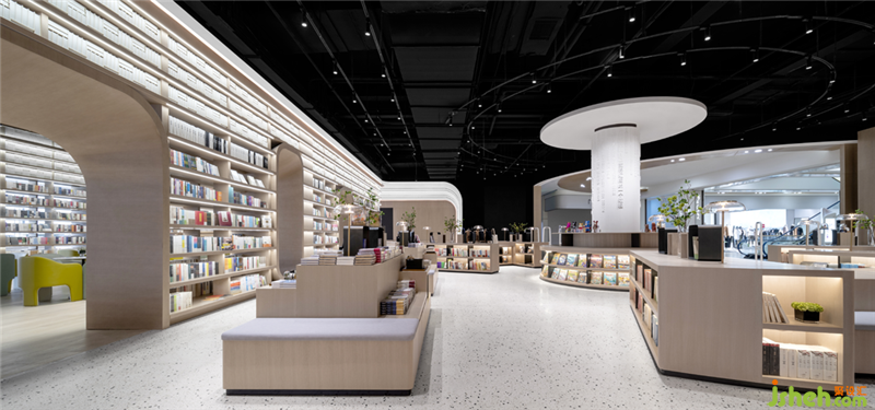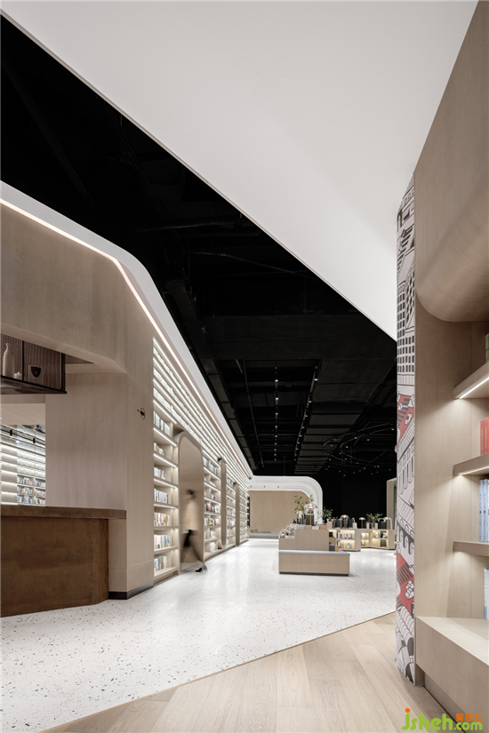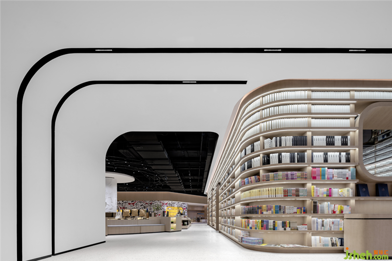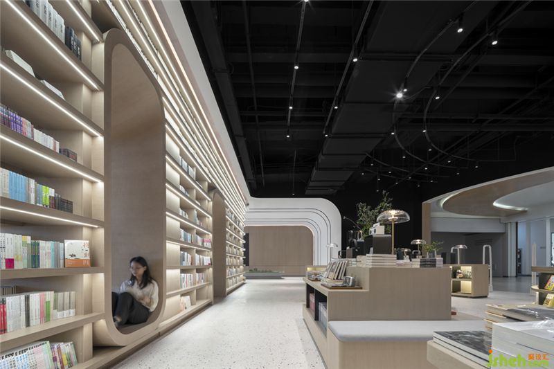 結(jié)合建筑弧形流動的線條作為設計的前提,結(jié)合商場內(nèi)部和建筑外部雙引流入口,空間在視覺造型上形成了順著弧線而流動的基底,兼顧以“書”為核心的消費動線以及以購房為核心的體驗動線,形成功能分區(qū),兩者之間互相交互、導流。兩條動線的交界之處,亦是空間線條流動的交匯處,位于整個空間的核心,此處設定為多功能空間,承載活動的功能,以書墻圍合,設置層層的階梯,既形成了空間的完整性,又保證了空間之間的交互。而在閱讀區(qū),設計則隔絕其他業(yè)態(tài)與動線的影響,讓閱讀行為葆有純粹的享受。圖書館設計