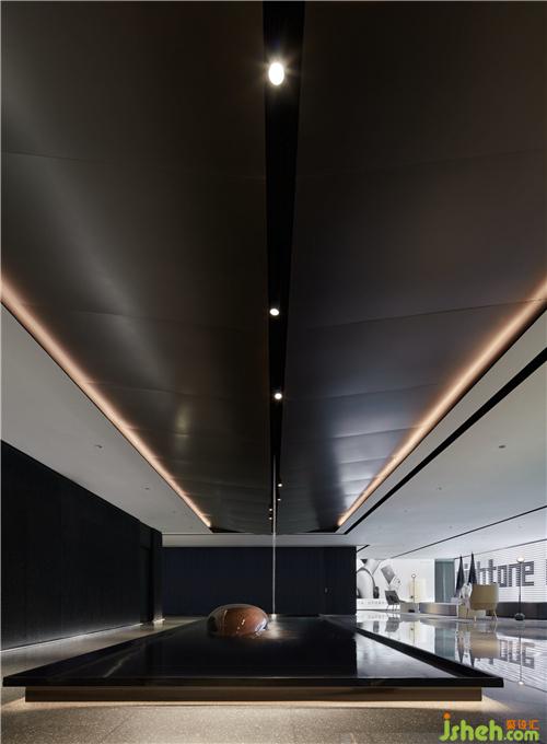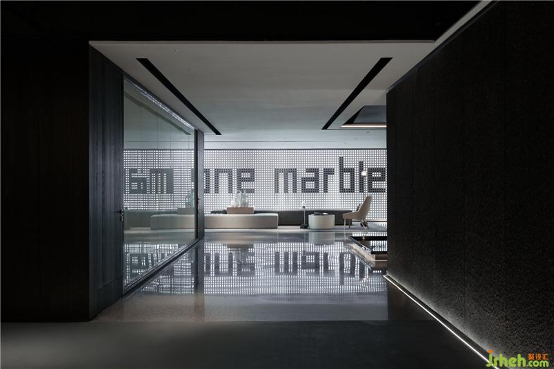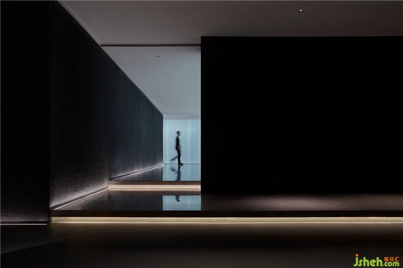 因此,在展廳的入口通過厚重的黑色石材,縱向條紋的鑿面肌理,在視覺上形成壓迫感,白光燈帶為行進(jìn)空間勾勒出線條,拉長(zhǎng)、延續(xù),當(dāng)從電梯中走出來,就已經(jīng)步入設(shè)計(jì)師為項(xiàng)目所鋪陳的故事當(dāng)中。裝修公司