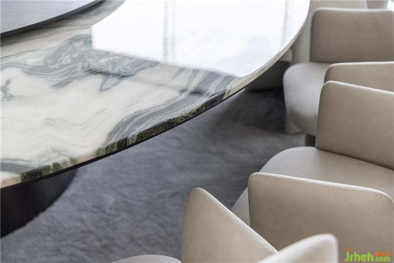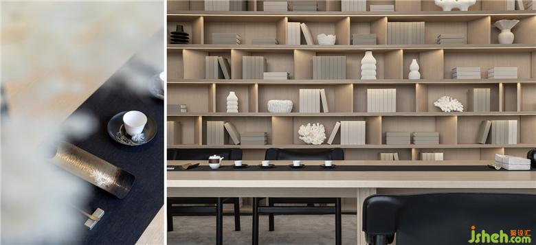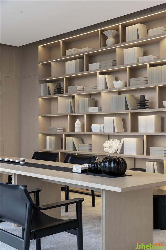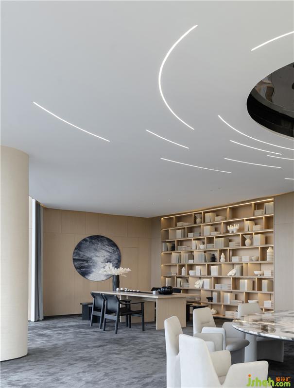 在這樣的自然環(huán)境中,售樓處設(shè)計(jì)室內(nèi)空間應(yīng)該是安靜且平和的,不應(yīng)過于繁復(fù),將主角讓渡于窗外的景色。因此,在整個(gè)二層空間,以白色和木色作為主基調(diào),墻面和頂面均為簡單的白色,藝術(shù)涂料細(xì)密的肌理讓光線變化極其豐富,地板則采用舒適溫馨的淺木色,在弱化空間界限性的同時(shí),以留白為來訪者帶來另一番體驗(yàn)。