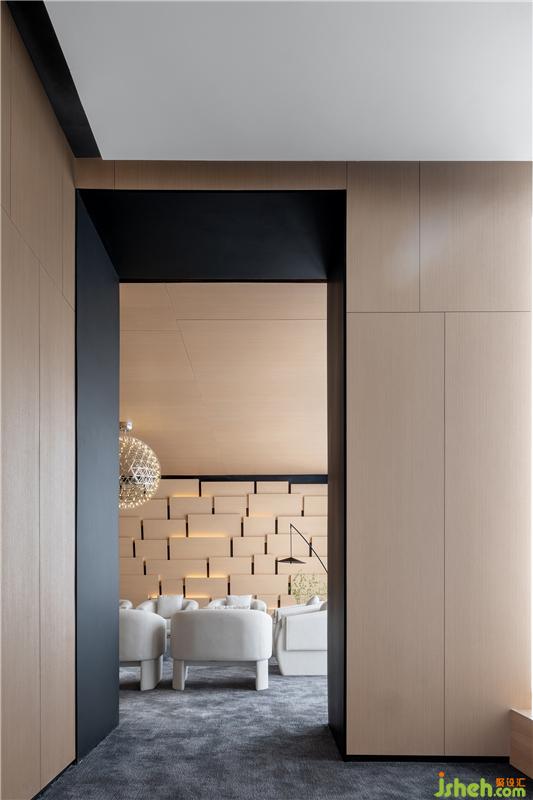 三層空間圍繞著中心的藝術裝置,由一個個彼此獨立而私密的功能板塊構成,材質上延續(xù)了整體空間的調性,卻切換了不同的面向,轉而以木質作為墻面,深色的絨面地毯,包裹起必要私密屬性,將開放的角度完全聚焦室外的景色。