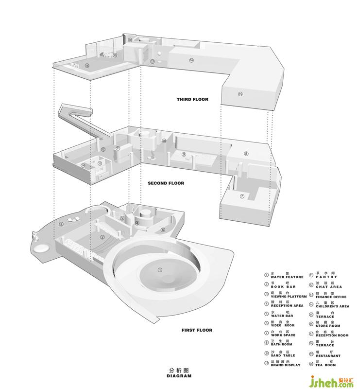 金屬飄帶是貫穿二層空間的天花裝置,透過光影的折射為空間的純凈添加了有趣的互動,于沙盤上方也與場地所賴的“兩江”線條互相呼應。
