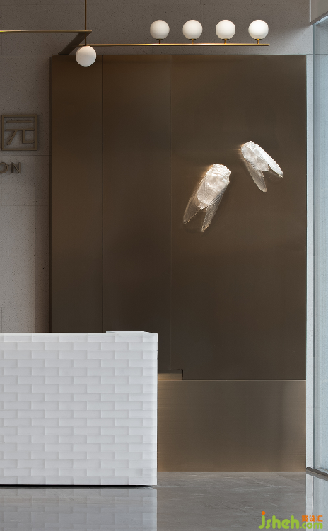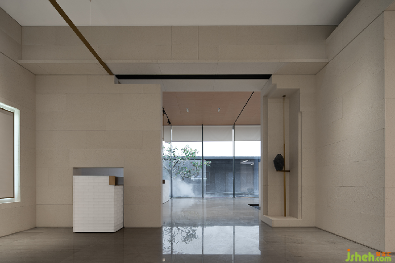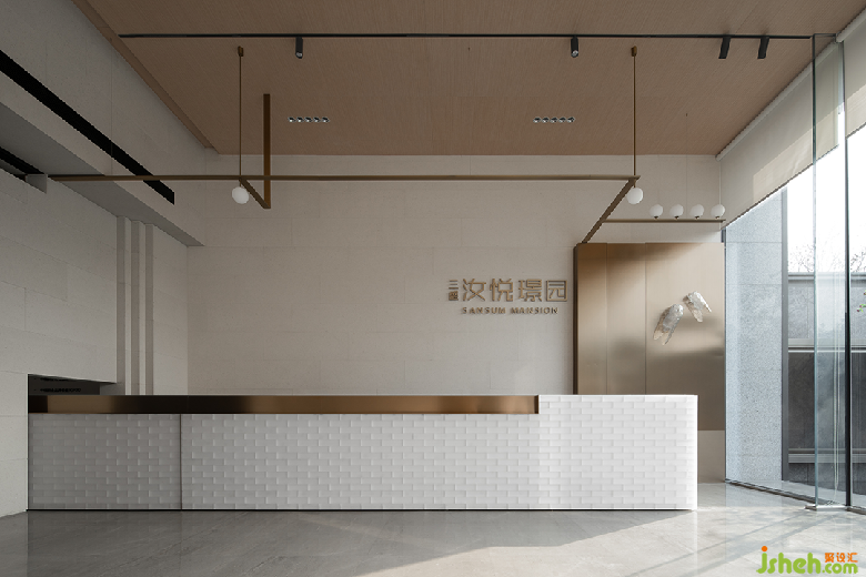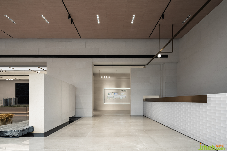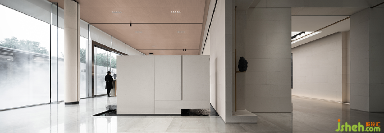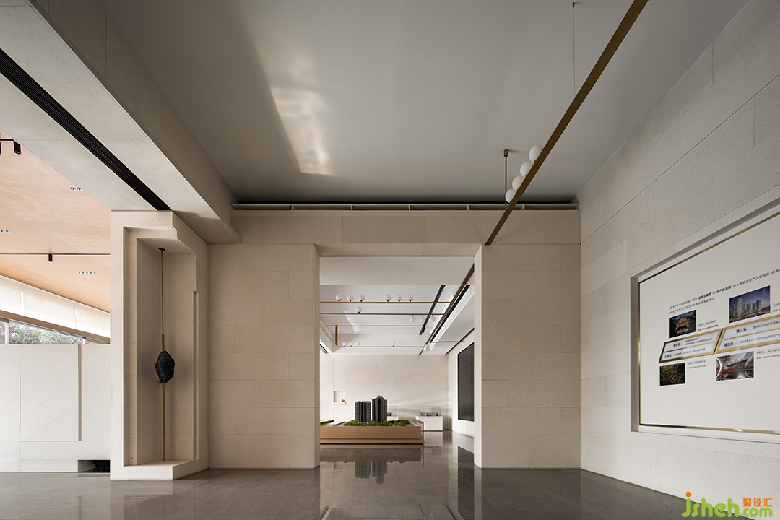 三盛汝悅璟園銷售中心,地處紹興大越路東側(cè)。室內(nèi)從零開始介入,與建筑、園林同步展開設(shè)計(jì)。建筑用圍墻隔離馬路的嘈雜,創(chuàng)造出靜謐的內(nèi)院式景觀。售樓處室內(nèi)設(shè)計(jì)與園林水景互為借景,設(shè)計(jì)師通過對景設(shè)框、借框得景,實(shí)現(xiàn)內(nèi)外空間的滲透和流動(dòng)。