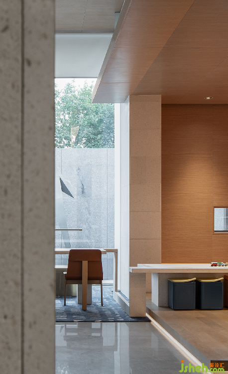 泉眼流水落在水面上,形成一片光影錯(cuò)動(dòng),倒映天花之上,形成另一番生動(dòng)的景致。木色天花如同嵌于天上的水道,將人的視線(xiàn)引向空間深處。