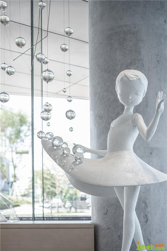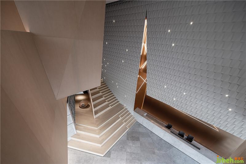 整個(gè)接待區(qū)域的墻面如折紙模型般含吮著光線,淺色水泥材質(zhì)以起伏制造出有如折痕的明暗。