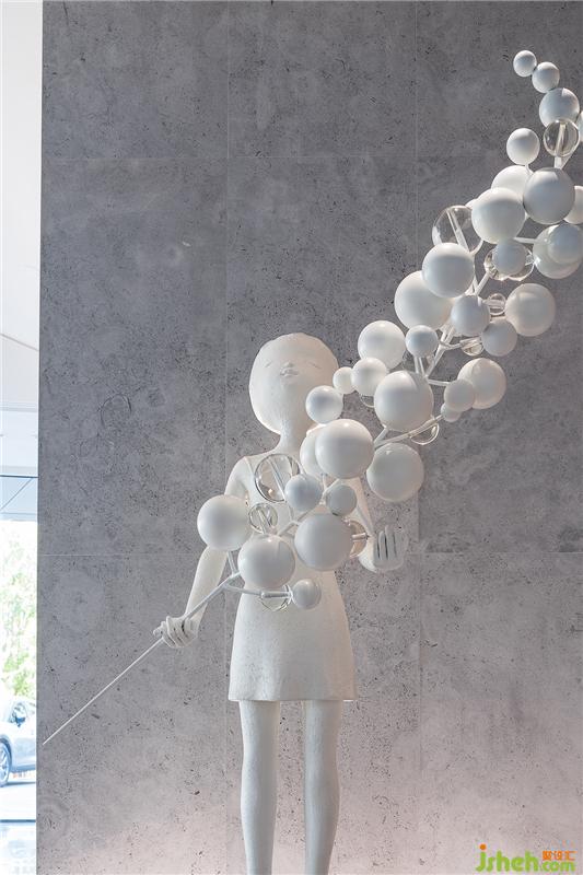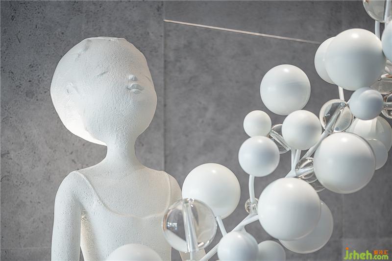 和某種邏輯相似,亦或是空間的嵌頓,對(duì)峙的氛圍間,接待臺(tái)的材質(zhì)讓空間裂隙中的用色趨向于漫射的自然光和幽微的燭光之間,結(jié)合追光少女裝置輕盈的形態(tài),成為空間中最溫存的所在。